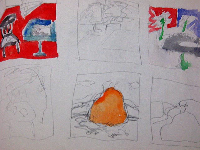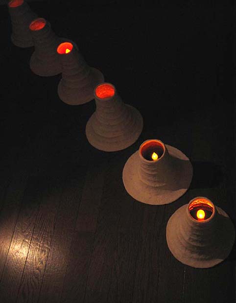 「ひと月に2度、満月がめぐってくることがあって、2度目の満月をブルームーンと言うんだよ」 昔、NYに住んでいた頃、友人に教えられました。 彼は、白人ながら毎日お経をあげるブディスト。穏やかな性格なのにパンクロックのギタリストでした。今でも、ブルームーンの夜には彼のことが頭をよぎります。 今夜の月は、大きな笠をかぶっていましたね。とても幻想的でした♪ いつも満月の日には、普段なかなか捨てられないものを捨てようと決めているけど、今夜はさほど気にしない。2度目の満月ですし。 でも、捨てることを前提に、過去のものに目を通してみました。昔のことを振り返ってみたくなったのは、おそらく、数日前に他界したJ.D.サリンジャーのことを考えていたからでしょう。 昔のスケッチブックには、サリンジャーの本の中の、私のお気に入りのコトバ、 Meet you at the next corner! をタイトルにした作品のメモがたくさん描かれていました。 上の英文は、ナゾナゾの答えです。 「壁がとなりの壁に何て言ったか」 に対するのが 「角のところで会いましょう!」 というわけです。 どの小説だったか、ちょっと思い出せないけど。(ナインストーリーズの中のどれかかな?) たわいない答えだけど、私はこれが好きでした。次元を超えた感覚(トポロジー的?)というか、哲学的というか。壁はとなりの壁と接しているのに、個々に壁として成り立っている。お互いの壁の関係性は共存か対立か。壁に意志があるとしたら、双方は立場を入れ替わろうとするか。もしかしたら、夜中にこっそり変形しているかもしれない。なんてね。 そんな、若き日のいろんなスケッチは(面白すぎて)人には見せられない(笑)。 でも、中には今の自分につながるものがあったので、ちょっとだけアップしちゃいます。 少し前の日記に 富士塚みたいなものを描いてた!と書きましたが、ちょうどそれらのメモにあたるものです。 心象風景のような、にじみ出てくるイメージ群。 こんなのや、 こんなのの中に、 この右上に、小山(または巨岩)が出現しました。 下のオレンジ色のものもそうです。そして、それをもとに描いたのが、以前の日記(画像の中には一番左端)にも出てくる これ。(油彩と金箔) もちろんこれも富士塚を知らない頃の作品だけど、展覧会でこれを見た人から「あなたは自己完結しているね」と言われました。 その意味を、私はあまりいいようには受けとめなかったけれど、その人はその解説をしないまま、私にどこかの遺跡について話し始めました。 不思議な感覚でした。初めて会った人が何か暗示するかのように言った言葉の端々に、私は特別なものを感じていました。 その連作(発表していないけれど)には こんなものもありました。(油彩と蜜鑞) やはり、築山や岩のイメージ。そして宇宙のイメージもありました。 スケッチブックに戻ります。 別のページにあったのが、 こんなスケッチに これ!さすがにこれには驚きました。まるで、 10数年後、富士山をモチーフに創った、VOLCANDLEの構想そのものではないかと! 昔の自分て何だろう。そう思わざるをえませんでした。未熟とか若いとかは関係ないのかもしれません。魂はすでに知っている。「未来の記憶」を覚えている。表現者はただ、それに気づき、ひとつひとつたぐり寄せる作業をすればいいのだ。 そんな風に思う、ブルームーンの夜でした。 捨てることは手放すことではなく、発見することかもしれませんね。