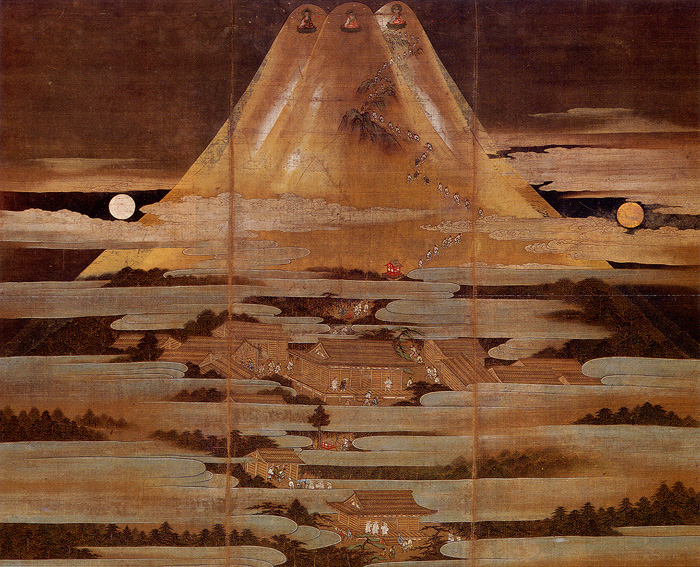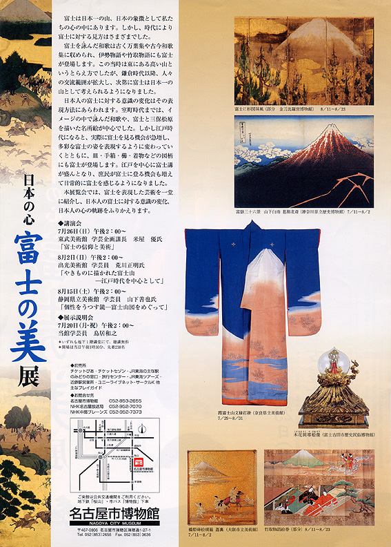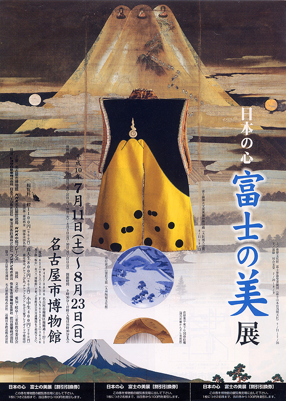 狩野元信の作と言われている「富士参詣曼荼羅図」は、有名な逸品です。 教科書にも出ていたかもしれない。 帰国し間もない頃。富士塚が気になったことから曼荼羅図の実物を見たいと思い、1998年春、これを所蔵する静岡県富士宮市の富士山本宮浅間大社へ向かいました。 「あのう、『富士参詣曼荼羅図』についてお伺いしたいのですが」 「公開はしていないですね。それに現在はここにはありません」 「といいますと?」 「富士山に関する展覧会のために、名古屋に貸し出しております」 よく意味がわからなかったけれど、ひとつピンときたことがありました。 帰宅後、私は母に連絡しました。 「今、○○ちゃん(歳の離れた私の従兄弟)は名古屋にいるんでしょ?もしかしたら、富士山の展覧会に関わっているかもしれないよ」 間もなくして、その従兄弟から母宛てに、フライヤーと東京展の招待券が届きました。 「今度こんな展覧会をやります。富士山好きな叔母さんに観ていただきたくて」 「知っていたわよ〜♪」 母の言葉に従兄弟はびっくりしたそうです。 「なんで知っているんですかー? まだ公表していないのに」 「ふふふ♪」 偶然知ったとはいえ、面白い展開でした。 これが、送られて来たフライヤー。まだ巡回先の東京展のフライヤーが仕上がっていなかったので、名古屋展のものです。「富士参詣曼荼羅図」を背後に「富士御神火文黒黄羅紗陣羽織」が中央に配された、目を引くデザインです。 私は、秀吉所用とされる「富士御神火文黒黄羅紗陣羽織」が大好き。このハデさ。この御神火のシェイプ。かなわないセンスです。そして、NY時代、本で見て興奮した「木花開耶姫像」がやって来る!ワクワク♪ また、同封されていた展示リストを見て、その多さに驚きました。あんなものやこんなものが一堂に!!! 東京展の開催場所は、当時池袋東武デパートにあった、東武美術館でした。何度か通いましたが、いつも大盛況の大入りでありました。会期は1998年12月5日〜1999年1月17日。 もちろん、富士塚の展示はなかったものの、富士講の遺物は数多く、図録にも富士塚に言及された解説がありました。 「木花開耶姫像」は、富士吉田の歴史民俗博物館ではまじかに見られますが、この時はかなり遠くに展示されており、コノハナさまのお顔を見るべく双眼鏡持参の人もいました。 それを思うと、先日放映された「美の壺」富士山特集でここまで寄れたのは快挙でした。このアングルではまず紹介されませんから。 ところで、その従兄弟の母親つまり私の伯母が、先日逝去しました。入院先の病室で、私が出るので楽しみにしていたという美の壺の放映に間に合ったとのこと、有り難いと思いました。 伯母さん、生前はお世話になりました。血縁という御縁に感謝いたします。身軽になった今、富士山の上空をひらりと飛んでいるのでしょうね。見晴らしはいかがですか? 合掌