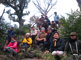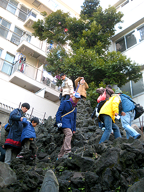 楽しく登拝をしてまいりました♪ このところぐずついていた空が、朝から晴れ渡りとっても爽やか。 集合前、背中に太陽の温かさを感じながら、東を向いて建つ鉄砲洲稲荷神社社殿にて、全員の安全登山を祈願いたしました。 バレンタイン♥旧正月♥新月の【富士塚ツアー】にお越しくださいまして、誠にありがとうございました。数名のキッズからティーン、80歳代のベテランまで、バラエティーに富んだ構成でした。総勢20数名。(途中で出入りあり、変動があったので、正確な数は割愛します) 上の画像は、ひとつ目の「鉄砲洲富士」登拝の様子です。 急峻の岩山はやはりインパクトあったようで、皆さん、まわりのマンションに囲まれている姿を、面白がってくださいました。嬉しい〜♪ 私が常々伝えたいと思っているのは、歴史的遺物を「たくさん訪れる達成感」ではなく、「現在の存在感、その面白さ」です。何度も移築を繰り返し、形が変わろうが、今に残って富士塚に登れることは、ある意味ミラクル。都市にあってビル群と「共存」するその姿から、人間のいろんな側面が見えてくるわけでして、そのへんをすぐわかってくださった参加者の皆さんに心から感謝いたします。 「いろんな側面」の『いろんな』については、【富士塚ナイト】でいじりましょう〜。 大山さんが「胎内めぐり」をして帰還したところ。生まれ変わって(?)晴れ晴れしておりました。 こちらは、みっつめの「音羽富士」頂上付近。 (モザイクがけのかわりに小さい画像にしましたがOK?) 私のお声がけがいたらず、麓にも大勢いらしたのに撮っちゃった。ごめんなさい!もっといろんなところで写真を撮ればよかったね〜。 ところで、(いつも書きますが)富士塚は行くたびに発見があります。 今回は、頂上の岩を指し「虎岩かも!」とご指摘くださったEさんに、皆でナットク〜! ありがとうございました。次回の登山図作りには是非虎岩も加えましょう。 また、富士登山のガイドされてるMさんが、塚の側面にシャクナゲが植えられているのを発見。富士山のお中道付近のシャクナゲ群生の再現か! さすがです♪ それを受け、私が中道杖の話をしましたが、杖の材料は「ソヨゴ」でした。訂正しおわびいたします! それから、坂の勾配を利用して造られたタイプの音羽富士に立ち、Nさんも「鉄砲洲はオブジェで、音羽は庭ですね」。これもスルドイ! 建築家(環境デザイン)の視点。 などなど、いくらでも出ました。 もちろん大山さんの地形的考察もふんだんに盛り込み、歩きまわり、地域を観察、私も大変勉強になりました。 とにかく皆さん、ツアーにいちばん大切な好奇心をたっぷり持って参加してくださり、私の「ここも見て〜」「あっちも歩いて〜」「これはこんなトリックよ〜」的な話に、皆さんの好奇心がブレンドされ、新たな発見を生んだことはとても有り難かったです。 これぞツアーの醍醐味です♪(以前は石碑に神代文字を発見して、大盛り上がりしたこともありました) そうそう、参加された方たちに宿題を出しましたね♪ 「自分の住んでるところに近い富士塚をひとつ、見つけて来てね」 【富士塚ナイト】も楽しみです。 ……………………………………………………………………………………… 【追記】2/18 Mさんの情報で、やはりシャクナゲの中道杖があることがわかりました〜。 ありがとうございました! 「中道杖」とはこんな姿。 これは、今でも品川富士のお山開きをされている、榎本先達が子供の頃に 富士登山したときの写真。昭和初期です。 子供達が手にしているのは金剛杖ですが、大人達が持っている 細長い杖が中道杖です。しなりが効きそうですね。 (先達は右から二人目) ………………………………………………………………………………………