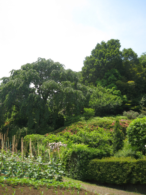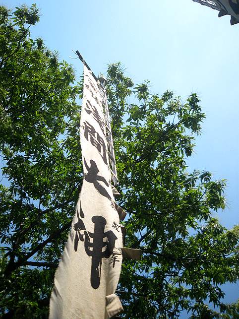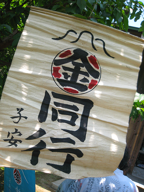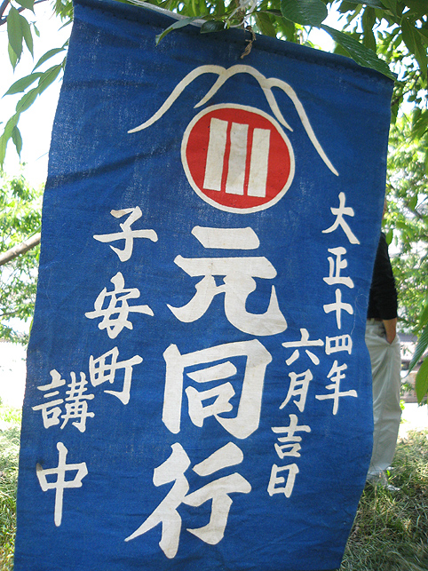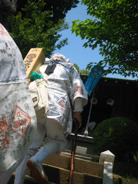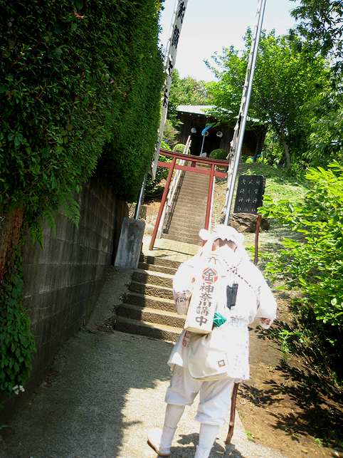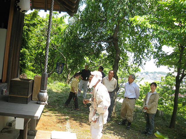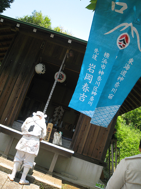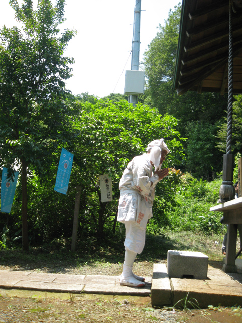 「次は『くまんど』だ」 「??? あぁ!『熊野堂』のことですね♪」 車から降りて、思わず撮った「熊野堂富士」。赤い花が咲いている手前の盛り上がりではなく、その背後の森の奥が富士塚です。 「大きいな〜!」 「登拝はまだまだ。まずは浅間神社で拝みをしなきゃ。先達を待っている人たちがいるしね」 最勝寺をはさんで、 右側にある浅間神社にお参りです。 幟も立ってる。 一歩一歩、石段を登れば社殿が見えて来ます。このワクワク感♪ 待ってらしたのは、地元の講の方たち。全員、社から外に出て先達を迎えます。毎年この日、社を開いて、先達がまわってくるのを楽しみにしています。これに近いアングルは この古い写真。はっきり見えませんが、遠景も写っています。 さらにこの写真。現場に行った人でないとわかりませんが、中央が熊野堂(現在最勝寺)で、右側が浅間神社。富士塚はお堂をはさんで左側です。(写真はいずれも日本常民文化研究所調査報告「富士講と富士塚」より) 先達の拝みはありがたい。 見慣れた水色のマネキのほか、子安のもの、和紙でできた古いマネキも掲げられていました。この後、いよいよ富士塚に登拝。そして再びここに戻ったとき、皆は嬉しい悲鳴をあげることに♪ つづく。。。