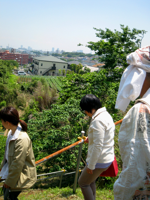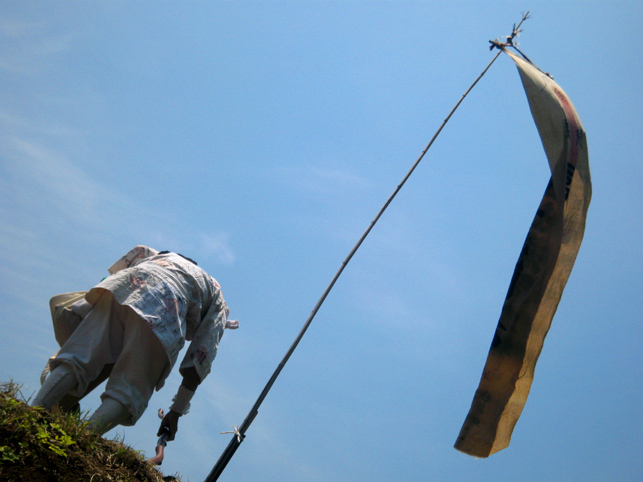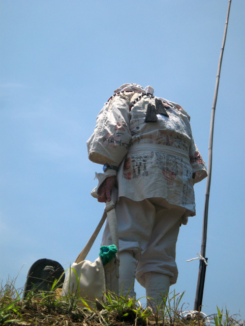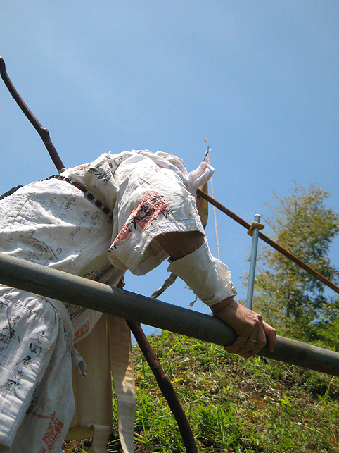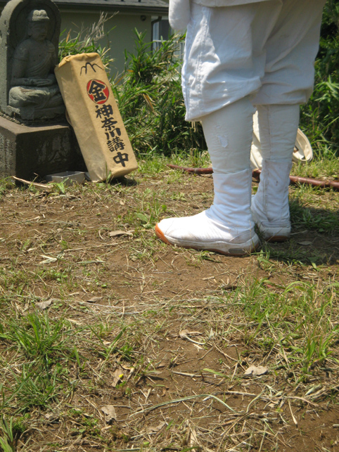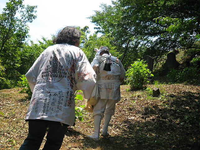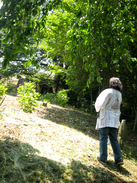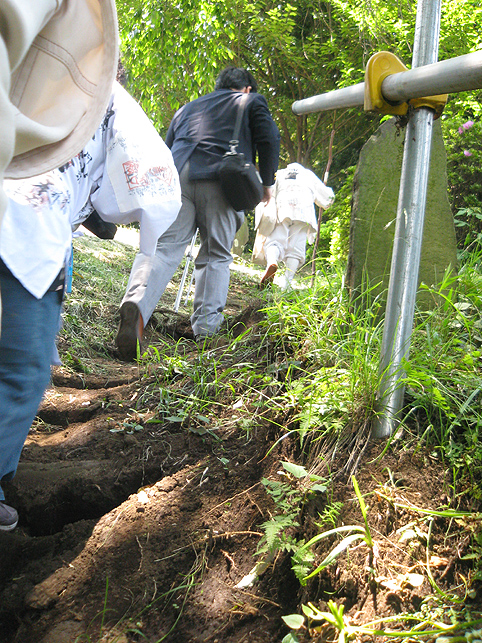 一同、浅間神社から一旦降りて、熊野堂富士へ向かいました。 最勝寺の御住職も一緒です。 登山口はかなり急です!土がむき出しなので、雨が降っているとかなりキケン。(鉄パイプの存在は必至です) 今回は、晴れ女が3人もいたから全く問題ございませんが(笑)。 先達を見ていると、地下足袋のほうが地面の感触をつかめてよさそうです。 「ふう〜っ」 ここまでもかなり急でしたが、ここからさらに登山となります。 多数のアイテムは、どうぞ私の本をご覧になってください(合目石かわりの碑が面白い!) ここから一気に、心をこめて登拝です。 頂上には、丸金講の大きな幟がはためいていました。先達は杖を置き、 大日如来座像に御身抜箱を立て掛け、拝みの始まりです。 先達の声、鈴(レイ)の響き、そして風の音。。。心にしみわたります。 頂上は、全員が立つスペースはない。拝みの後、交代で大日如来に手を合わせました。 標高にしたらどのくらいあるのでしょう。怖いくらいの高さです。 今ほど木々が延びていなかった頃、ストレートに視界に入る富士山の姿は、まさに神様に見えたに違いありません。 下山のほうが緊張します。こんなに急です! 左手、トタン屋根の小屋には、 拝みつづけている身禄像。 つづく。。。