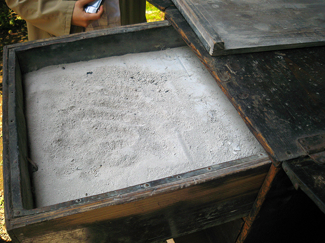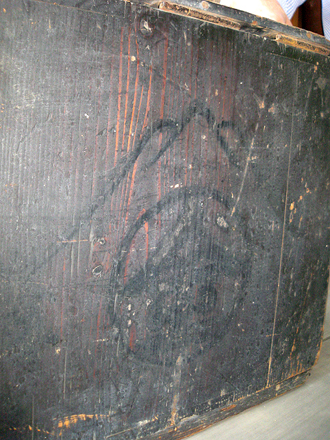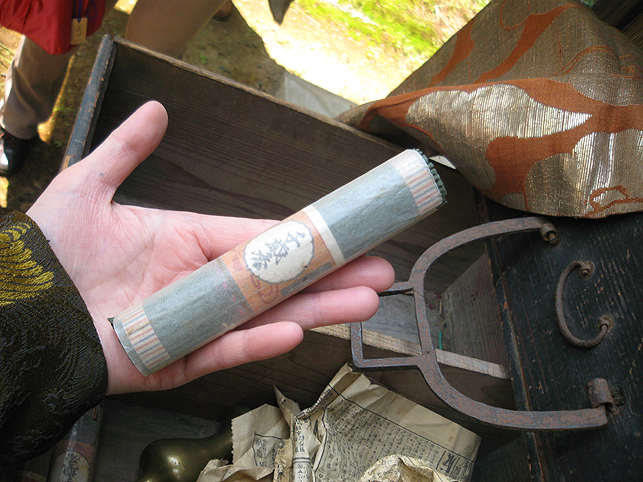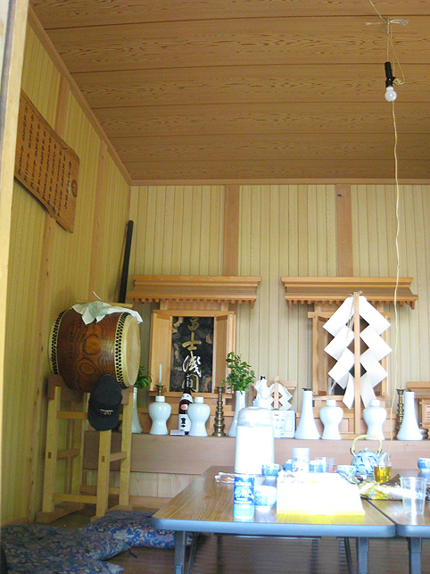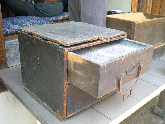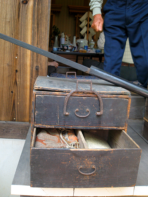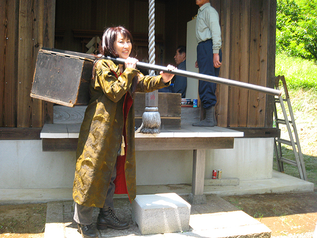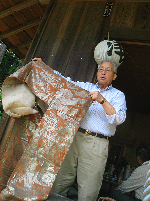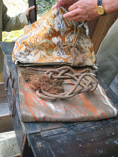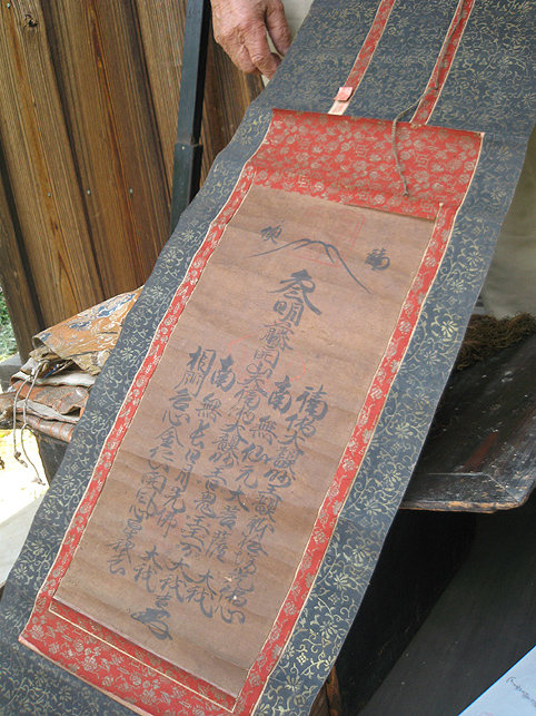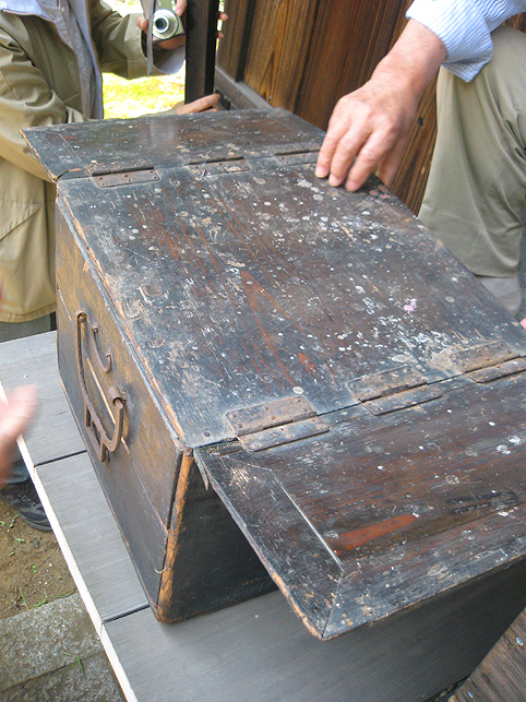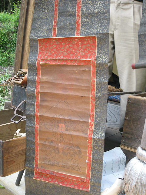 熊野堂富士を下り、次の富士塚に向かう前にもう一度浅間神社に行きました。(先達は車の中でお留守番) ふとしたことから、講の方たちが「拝み箪笥」を見せてくれることになったのです。 拝み箪笥とは、お焚き上げをする時に使う火鉢が入っていたり、祭壇に早変わりする祭具の収納箱。引き出しもついていて、まさに箪笥のように収納できます。 正面から見ると、手前に引き出しふたつ。 側面には、丸金講の紋が描かれていました。 天板を開けば、そこに祭具を置くことができます。 では、上の段から。 中には灰がびっしり入っていました。ここに線香を富士山型に積み上げて、お焚き上げをします。→【千葉市稲毛で見せていただいたお焚き上げ】はこんなです。 「貴重な灰ですね〜」 「昔の灰がそのままですね〜」 下の段には、こまごまと祭具がびっしり。お焚き上げに使われていた線香は、未開封の千歳香。古新聞は大正時代の日付け? 「この布は何だったかな」 講の方も記憶が曖昧になるほど、長いこと使っていないという。 「すごい織りじゃないですか! 飾り紐も豪華で」 「わぁ〜♪ これら江戸時代のものですよ!」 すかさず学芸員Mさんが叫ぶ。さすがです。でもこれってナニ? 「私たちもちゃんと見てないから、これが何かよくわかんない」 と言いながら、広げた布は細長く、コの字型に縫い合わせられていました。 Mさんがすぐに指摘。「これは祠の扉まわりにつけられる幕ですよ」 てことは、あああれか?社殿の奥には神様がいらっしゃるけど、あの扉のまわりにつくものか。ふむふむ。 帰宅後、確認したらオドロキでした。 古い写真には、今と同じく「富士浅間宮」が写っていた。そして見せていただいたのと同じ柄(白黒だけど)の幕が2種、見えます。 オレンジ地色に銀糸の龍は、まわりの幕に。山吹色に青いキント雲と鳳凰は、内側の幕として、ちゃんと使っていたのですね。それにしても豪華だなぁ〜! もう驚嘆の連続です。私たちが嬌声を上げていたら、講元がつぶやいた。 「先達さんが持っていた長い袋ね、あれとそっくりのがここにもありますよ」 「ええー!!!御身抜箱が!?」 「これこれ。同じでしょ?」 「ああ!ホントだ♪」 丸金講はいくつか枝分かれしています。岩岡先達は丸金講神奈川講社だけど、ここは何だっけかな。ちなみに、丸金講の金は、昔の先達の姓「金子」からとったものと思われます(ここには金子姓がたいへん多く、講元以外も皆、金子さんです)が、本来ならば神奈川の神をつけて丸神講とするところ、神とつけるには畏れ多いと、先達の名字からとったようです。 講元がおっしゃいました。 「中は長いこと開けていないんです。何が入っていたんだろう」 「御三幅です♪ 掛軸が3本入っているはず」 全員が即答したので、驚いたのは講元御本人でした。まあ、岩岡先達に同行するくらい、ハンパない集団です。詳しくてあたりまえ(笑)。 もう流れにまかすしかない講元。急遽、お宝のお披露目となりました。 感謝感激アメアラレ。 相州最乗禅寺からいただいた掛軸のようです。最乗禅寺とは、神奈川県南足柄市の大雄山最乗寺のこと。富士講と縁の深いお寺です。(十条富士を守る富士講の講員も、大雄山最乗寺道了講に入ってます) ともかく、素晴らしいお宝をたくさん拝ませていただいて、われわれはとても満足。 「来年は、これらの掛軸を掲げてくださいな。お焚き上げだって岩岡先達がやってくださるでしょう。私たちも参りますから是非是非!」 などと大いに盛り上がったのでした。本当にありがとうございました! そうそう。拝み箪笥は左右に金具がついており、棹を通せば担げます。 コツは、背中を箪笥に密着させること。でも難しい。 笑っているけど、実はメチャメチャ重いのです! 箪笥は火事の時に担ぐものだと思ってた(笑)。