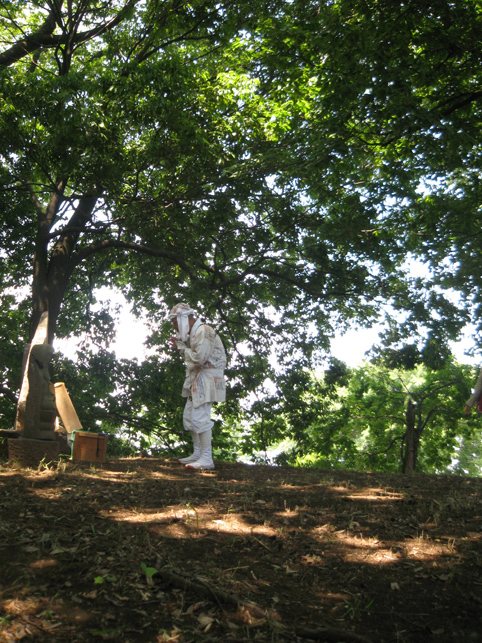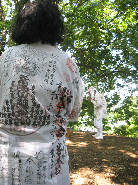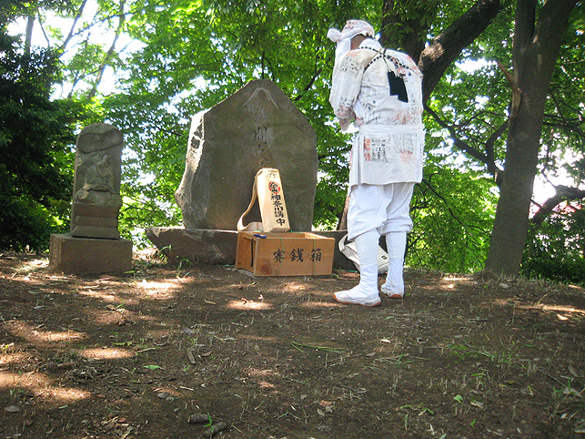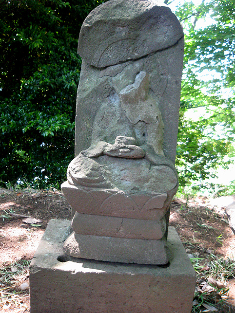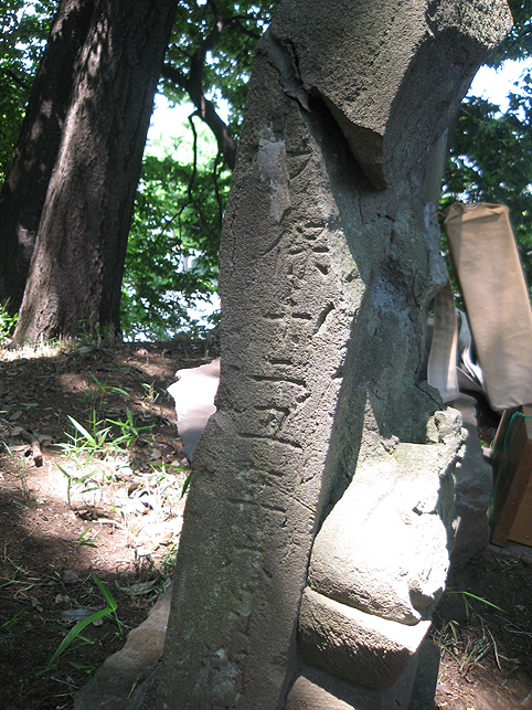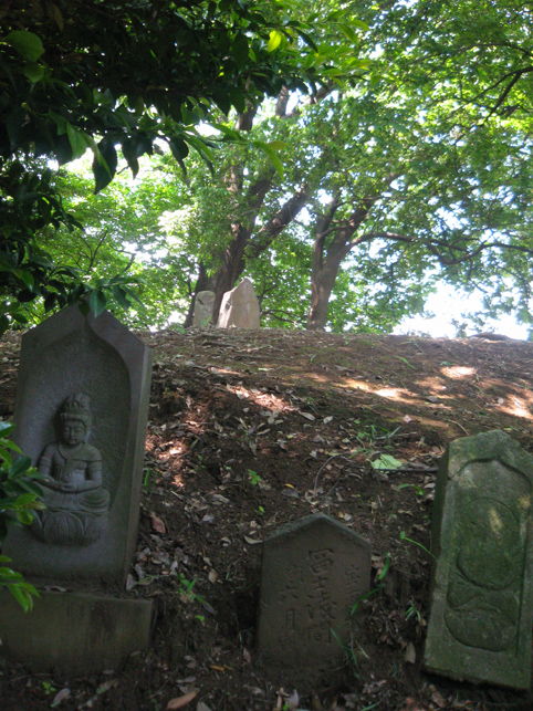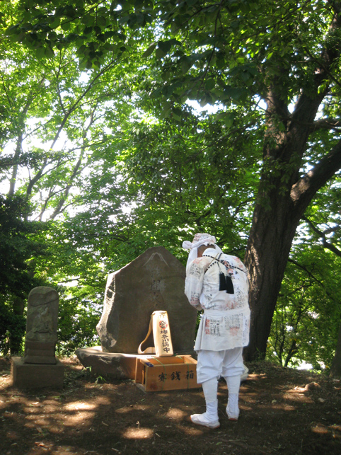 ここ中村富士は、雰囲気は最初に訪れた小机富士に似ているけれど、もっと清々しさを感じました。 頂上付近に植えられているマサカキ(神社や神棚でお馴染み。サカキより大ぶり)のせいでしょうか。木漏れ日が、マサカキの枝に結わえられたマネキを照らしていました。 頂上はかなり広い。森の中の円形ステージだ。 ここを管理するのは近くの長導寺の檀家の方々で、農家をやってらっしゃいます。清掃が行き届いていて、草もきれいに刈り込んであるのを見て、先達はとても喜んでました。 「ここねぇ、前はキャベツの収穫が忙しいって、門も閉まったままだったけど、最近は開けといてくれるんです♪」 私たちも、最初は先達と一緒に手を合わせていましたが、この空間に先達と一緒にいられることがただ有り難く、 その姿を目に焼きつけたくて、しばらく遠巻きに眺めていました。 優しく流れる先達の声に包まれ、木漏れ日はいつしか位置を変え、御身抜箱を照らしていました。そのドラマチックな様子は、皆の心のスクリーンにも焼きつきました。 頂上の浅間大菩薩の碑の横には、手に何か持つ大日如来座像。天保十二丑年六月朔日とある。やはり昔から六月一日に山開きがあったからでしょう。 七富士参りは東京でもありますが、現在ではたいてい七月一日に行われます。 「ここが一番早い七富士参りですよ」と先達。 塚の隣は、公園になっています。この斜面の中腹に、小御嶽の石碑があるそうです。 登って来た道をたどり、もう一度石碑と石仏を拝みながら下りました。(右は身禄像らしい)
