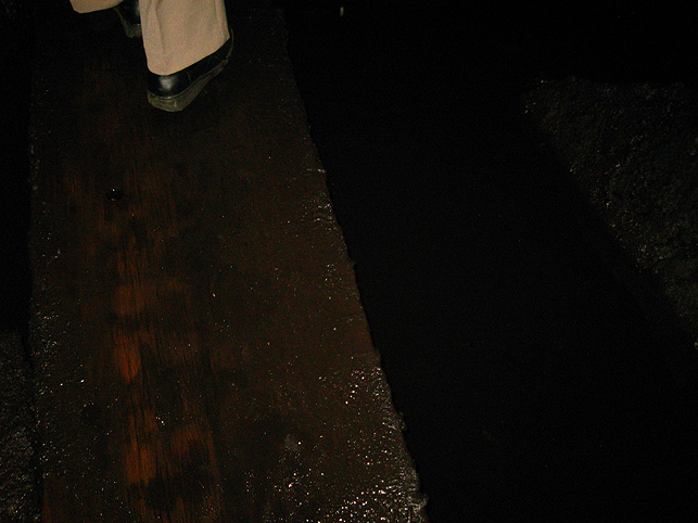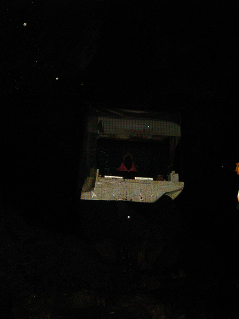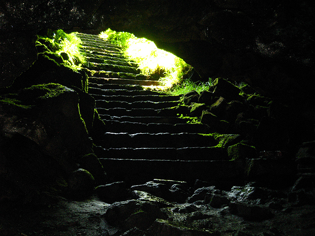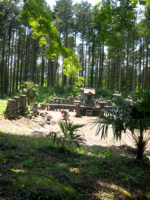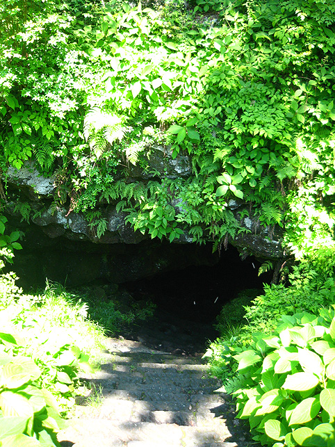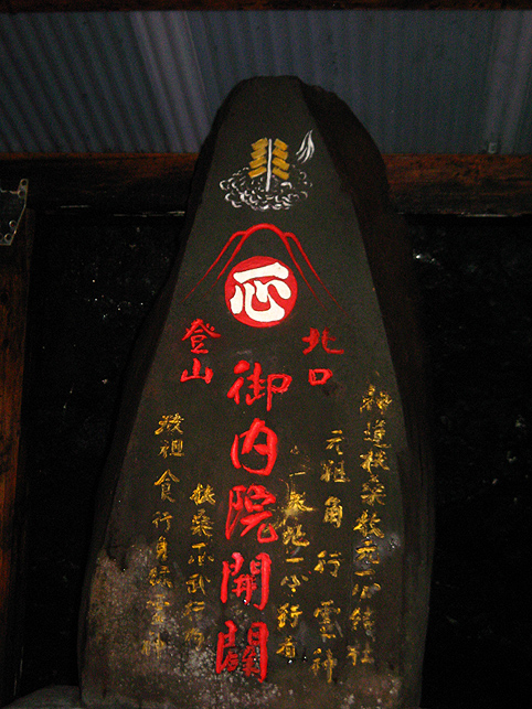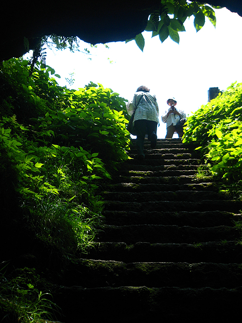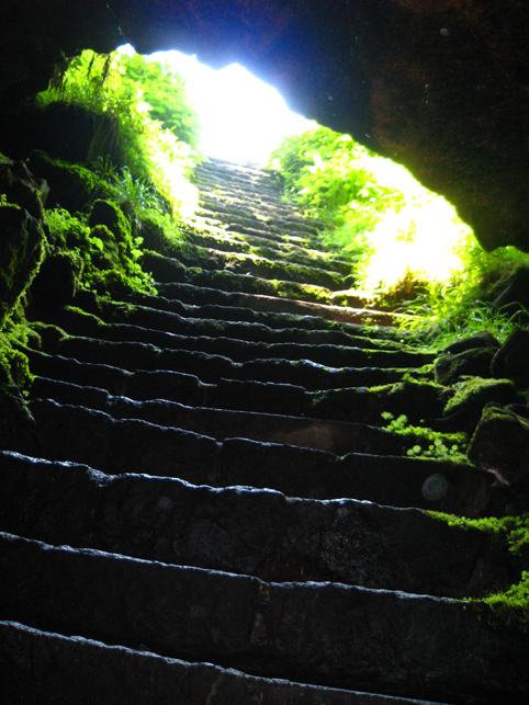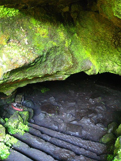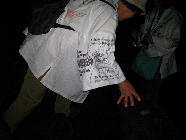 世間では、パワースポットというよりミステリースポットとして知られている(知られていないかな?笑)「人穴」ですが、結論から言えば前者です。少なくとも私にとっては。 富士塚が気になると、それを造った富士講が気になる。富士講を知るとその源流が気になる。富士山信仰は古来からあったけれど、富士講に受け継がれる教えを唱えた「角行」ゆかりの地は、やはりスペシャル。ここが原点だからです。 前方に「冨士浅間大神」の碑と玉垣があり(大日堂は森の奥にある)、手前下方に穴が口を開けています。幅3mほどの穴の入口です。 中は80mほどの長い洞穴です。歩いたルートを点線で示しました。左側通行です。ずっと奥には浅間大神の碑があるそうですが、3分の2くらいにある石像のあたりから右に迂回し、出てきました。 では、ひんやりとした地下の世界へ。 石段を下りきると、かがまなければ入れない低い入口でした。左の足元には石仏あり。 振り返ったところ。地上に続く石段が美しく印象的。 中は漆黒の闇でした。かなり涼しく、天井からは水滴が落ちてきます。写真に撮ったら岩肌は赤と黒。溶岩が冷えて固まった時の形状を残しています。前方奥に見えるのは、トタン屋根のついた小屋のような祠のような。。。 中にあったのは、この碑でした。新しめのものですね。上部に描かれた御幣は雲に乗っていて面白い。扶桑教元一心講社による御内院開闢(内院とは頂上の火口のこと)とある。おまけに北口登山。ここは富士宮ですが、いろんな信徒がやって来たのですね。 「いつもは蝋燭に火が灯っているんですけど、今日はひとつもついていないですね」とKさん。本当に真っ暗です。「ここから左に進みます」 幅の狭い渡り板が敷かれてあるのでその上を歩きます。「落ちたら水の中ですよ〜」 やがて天井が高くなり、広さもあるのがわかるけど、とにかく足元が見えない。手持ちの明りは、小さなものがふたつだけ。4人は離れないよう気をつけながらゆっくりと進みました。落ちないように滑らないように、牛歩のごとく。 明りがないのは、この闇に溶け込むいい機会となりました。短時間で行者の気持ちにふれるなんてことはありえないけれど、闇の中にいる意味が何となくわかってきました。 この空間に入って、まず私が感じたのは安堵感。暗くて湿気が多いのに、恐怖感が全くない。いきなり「居心地いいですね〜」と発した私でした。でもまあ、たったひとりで闇の住人になったなら、恐怖心と闘うことになるのだろうけど、それはいずれ解消されるはず。なぜなら、漆黒の闇では自分が生きているのか死んでいるのかわからなくなるから。そして、生死の境界は問題ではなくなり、精神的レベルで問答を繰り返し、やがて地球の声を聞くことでしょう。それは創造主の声に違いない。 しばらく行くと、岩山のような盛り上がりがありました。その上のほうに石像が。遠くて見えず、暗くてわからず。落下する水滴が白く写っていました。 ここからUターン。岩の間を手探りで向きを変えます。「滑らないで〜」 帰路、闇に慣れてきた一行はおしゃべりをする余裕が出てきました。 「角行さん、『立ち行』って一日に何度か分けて立っていたんだよね?」 「たしかそう」 角行は、四方4寸5分の角材に乗って爪先立ち1000日の行をしたと言われていますが、伝説の域を脱しない数字なので、今まであまり考えていなかったけど。 なるほどね。ラマダンだって丸一日中断食するわけじゃないし……と納得する私。 身体を通して精神を鍛練する修行は、信仰のなせる業であって、人に見つめられながら挑戦するギネス記録とはわけが違うのだ(笑)。一過性の記録挑戦が目的ではなく、継続性が必要。だから身体を壊しては何も生まれない。 さあ、地上に戻るわよ。 やはり光はありがたい。 太陽が嬉しい。 生還する喜びは、闇をくぐったからこそ。 境内に戻ると、式典の行われていた墓碑群の一角はきれいに片づけられていました。 そこは、ぽっかりと太陽が注ぎ込む浄土の領域。地下で見たのが陰の浄土なら、ここは陽の浄土だ。 信徒たちがこの聖地に引き寄せられたのがよくわかるようでした。