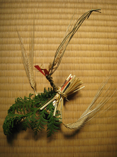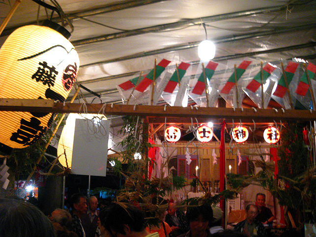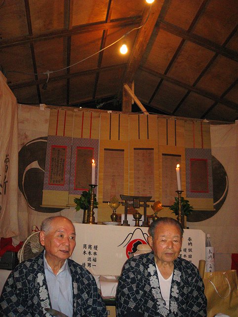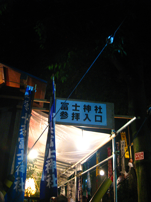 7月1日はホントに大忙し。朝に山開きの儀式があると思えば、夜は祭で熱気を帯びる町がある。こちらは夜編。この日最後のロケ現場、十条富士へ向かいました。 日光御成道でもある岩槻街道に到着すると、空は藍色がかって深みを増していました。旧道は、地面から異様な熱気が立ちのぼり、すれ違う人々も浮かれ目をしている。前方の森が十条のお富士さんです。 ひしめく露店から、いろんな匂いが混ざって流れてくる。 祭びとの望む早さで、闇が一気に降りてきました。富士塚はもはや形が見えない。 登山口が、見世物小屋のように妖しげです。 祭の時だけ小屋の立つ、ここが富士神社で、 昔と変わらぬ御三幅と御神体がお披露目されています。 お富士さんの登山口。人々は列をなして登って行きます。まるで宇宙船に吸い込まれるかのように。 毎年おなじみのお札や護摩木や線香の中で、ひときわハデなかたまりがありました。「麦わら蛇」(神龍)がバージョンアップしたのでした。 「麦の穂を切り落とさないで、うまく使ったんです」 富士講の世話人、Sさんが誇らしげに教えてくれました。麦穂は龍のヒゲとなって、確かに迫力が出た。枝振りの……じゃなかった、ヒゲ振りのよいものをSさんが選んでくれました。 講の方たちは何だか以前よりも熱心でした。岩槻街道の拡張計画のため、富士塚はそう遠くない将来に取り壊されることになっています。塚が消えるまで、彼らは地域に残ったハレの灯を燃焼しようとしているのでしょうか。とても熱いものを感じました。 富士塚の頂上では、お焚き上げの火が例年より遅くまで燃やされていました。