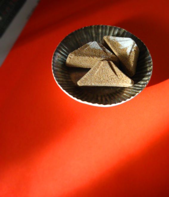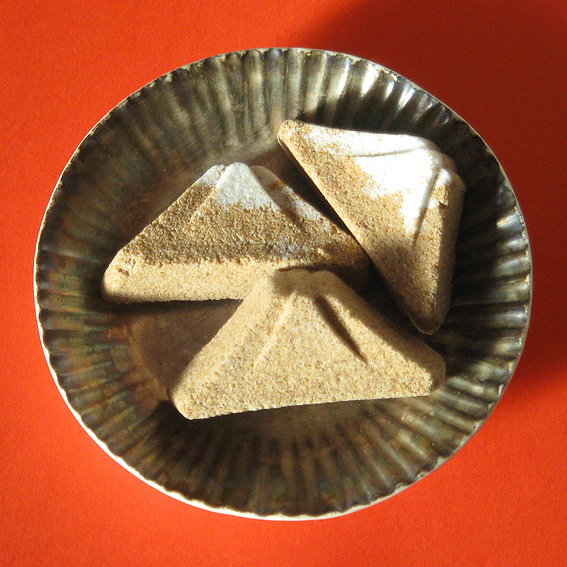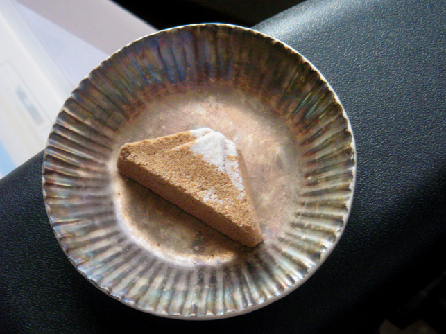 十条富士の麦わら蛇を出したら、駒込富士の神龍も出しておきましょう。 材料と作りは、十条のものと同じですが、雰囲気が微妙に違います。 そして、駒込富士にはもうひとつ気になる縁起物、富士山の麦らくがんがあります。 これにはみっつの魅力があります。 まず、そのすばらしい「シェイプ」。シンプルかつ完璧なカーブとモデリング。 ふたつめは「隠れキャラ」。というとオーバーですが、袋に入っている約30個のらくがんの中に、雪のかぶった富士が混ざっています。その数2個〜7個。このアソビゴコロがたまらない! 昨年は、この雪のせ富士がなかったのですが、今年復活して嬉しいです♪ そしてみっつめはその「お味」。香ばしくてとても美味です。和菓子をほとんど食べない私も、これにはうなりました。湿気らないうちに食べるべし。 須藤拓也氏の銀彩豆皿にひとつ。銀はかなり黒ずんでしまいましたが、お気に入りの器です♪ 椅子のアームに乗せて撮影。 それから、下谷坂本富士のお山開きの蛇土鈴(左)。昨年は売り切れで買えず。 右側は2年前のものですが、土の色とディテールが違ってました。音の高さも違います。ちなみにその右側は小さな花器(徳田吉美作)で、これも上部は銀です。(私はつくづく銀が好きなのだなあ。。。) 以上、いただいた縁起物のお土産です。NさまRさま、感謝です♪