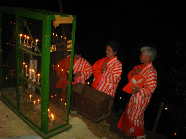 小さい松明が燃えつきると、しばらくして大きい松明での神事です。 「どうして2つの松明を焚くのでしょうか?」 「長くお焚き上げを続けるということでしょう」 円柱状の松明は、吉田の火祭りの松明に似ています。 吉田のほうは松が材料ですが、こちらは桑の木。この地区では、昔から養蚕業が盛んだったので、桑の木も豊富でした。 「でも今はこの松明を作るために、桑の木を確保するのが大変なんです」 清瀬の火の花祭りで見られる麦藁と同じ運命ですね。 「昔は、養蚕やってる家が200軒もありましたよ。各家から少しずつ集めてもあっという間に松明ができたけど、今はもう農家も少ないから。。。」 清瀬でも広瀬でも、祭りを存続するために材料を育てる畑が欠かせません。いずれも市の無形民俗文化財になったことで、材料確保のミッションも課せられたわけです。考えると複雑な思いがしました。祭礼の継承だけでなく、物理的な御苦労もあるのです。 大松明は、四角に仕切られた神域の中で点火されます。講の方たちは、注連縄すれすれの外側に位置し、拝みを上げます。 かつては、この細い注連縄に各家から持ち寄った富士山(浅間神社)の掛軸を掛け、お焚き上げの炎にかざしたそうです。 「お浄めですね?」 「虫干しみたいなもんだ(笑)」 四方を塩で浄める。火の中へも。 祭りは、昔に比べたらかなり簡略化されているとのこと。かつて、火にかざす掛軸は注連縄に隙間のないほど集められたといいます。拝みの時間もおそらく短縮化されているでしょう。行衣にしても昔は正式な出で立ちだった。 それでも祈願の要素は不変です。「豊作」「安産」「鎮火」のみっつ。 富士塚の下では、広瀬囃子で盛り上がる。そして盆踊り。ミニコンサート。 一方、頂上は。。。 老若男女で賑わっていました。 お腹の大きな女性もいれば、家族でいたわりながら登拝する人々、知り合いのために蝋燭をいただく人、また、安産のお礼にとベイビーを抱いて登る人々。登山道には列ができていました。その光景は、初山みたいで微笑ましかったです。 こちらの講は、広瀬のろを取って「丸ろ講」。 「ろという文字が万に見えますね」 講元のTさんが、庚申堂に掲げられてある板札を並べてくれました。 「○の中にいっぱい『ろ』と書く人とそうでない人がいます。自分はいっぱいに書きますが」 そうそう、この火祭りのことを「スイカマチ」と呼ぶ人がいました。 戦後、屋台ではスイカ売りがたくさん出ていたからだそうです。 今年、私はスイカ食べたっけかな?