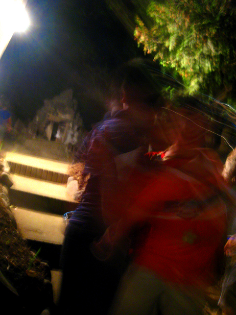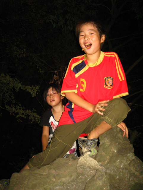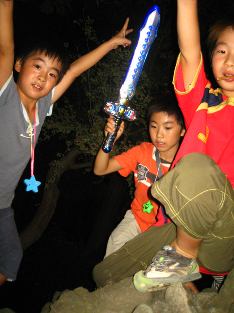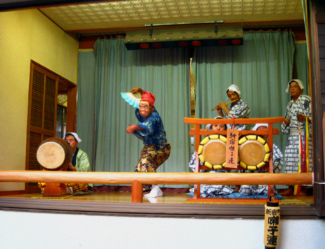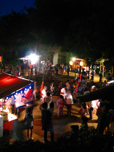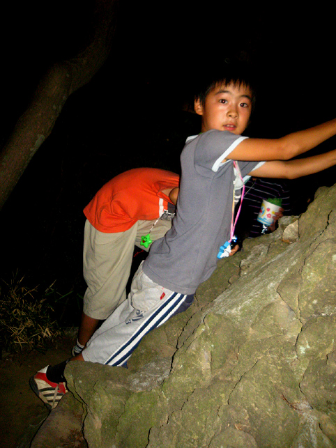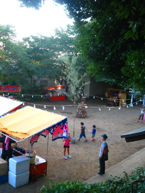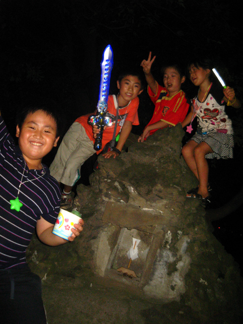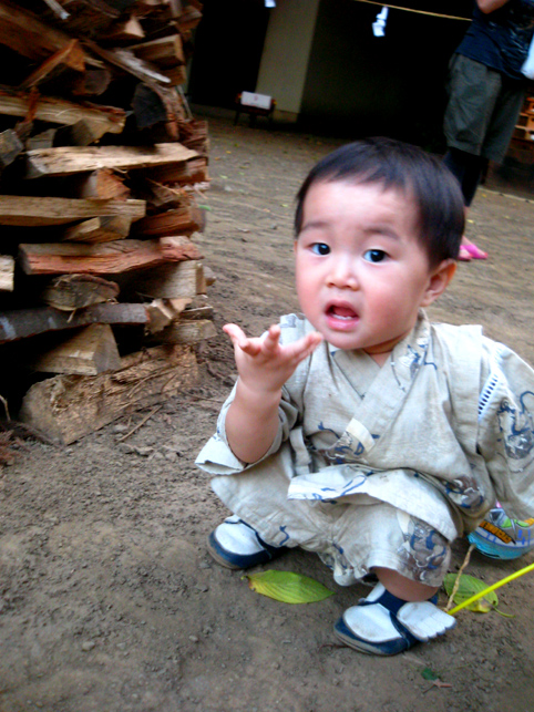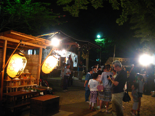 なごり惜しかったのですが、「火の花祭り」の始まる前に中里を後にしました。 9月1日は、知っているだけでも4か所の富士塚で火祭りがあるのです。 残り3つのうち、今回向かったのは川越の雀ノ森氷川神社。 手についた土を、舐めようとした子供に注意したらこの表情。思わず吹きました♪ 傍にはお焚き上げの松明があります。 木片を積み上げた松明の上には、着火用の杉の葉と細木の束。それに御幣。 広瀬富士のお焚き上げのように、松明を中心に神域が作られていました。 境内の東北に位置する富士塚の頂上から見たところです。 富士塚はとてもシンプル。登るというより、儀式のための構造のよう。 とはいえ、斜面には古い石碑の数々。 松明の近くに浅間神社の仮宮も設えて。 お囃子も盛り上がってまいりました。新宿と書いて「あらじゅく」と読みます。 富士塚のある地域には、お山開きといい火祭り(お山仕舞い)といい、お囃子連が活躍します。それは、単なる町内の祭りでないことのあかし。お囃子は、神様に奉納する意味があるからです。 さて、夜の帳がおりました。 盆踊りも始まりましたね。 氷川神社も浅間神社仮宮も、闇の中で映える時刻。 冨士浅間神社の文字の裏側は、「御水講」。 渋谷の山吉(ヤマキチ)講の枝講で、砂町のオミズコウともファミリーですね。 でもここでは「おんみずこう」と呼ばれます。 お焚き上げの始まる8時にはまだちょっと時間がある。もう一度、富士塚に登ってみよう。 目の前を、数人の子供達が駆け登って行きました。 「写真、撮って。撮って〜!」 彼らは、慣れたように奥宮によじ登り、はしゃいでいました。 しょうがないなぁ。 「ここには富士山の神様がいるんでしょ?」 「うん!」 「普段は乗っていないよね?」 「うん!」 「じゃ、いっか。今日はお祭りだからね〜」 考えてみたら、彼らはこの地で「安産祈願」をもって生まれ、「初山参り」で祝福された子供たちなのです。富士山の御加護をいただいている彼らは、こうして富士山と戯れて育つのでしょう。 いい子たちでした。 別れ際、 「ありがとうございました。盛り上がりました!」 なんて、お礼を言われた時には笑ってしまいました〜♪ あ、気づくともう8時。 行者たちは出番待ちです。 つづく。。。