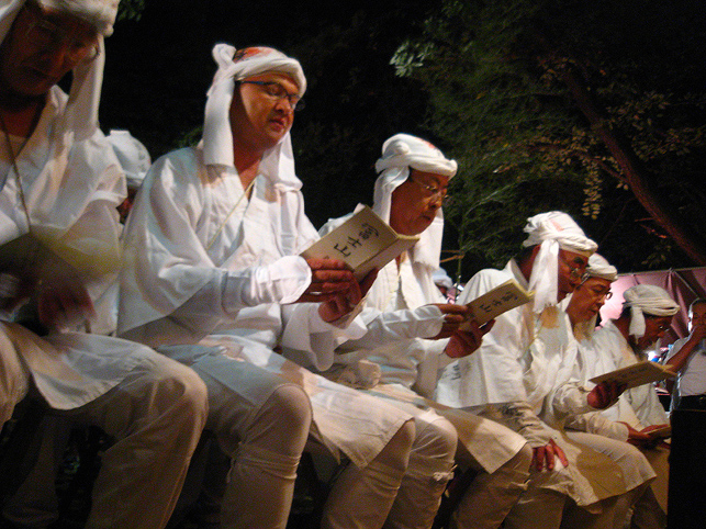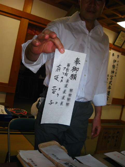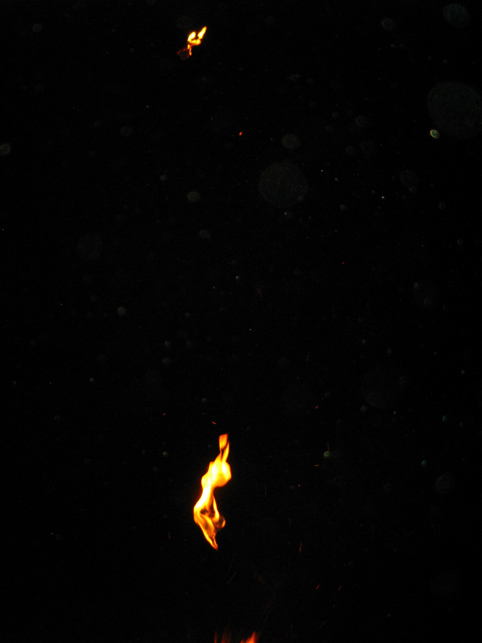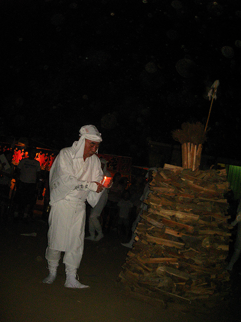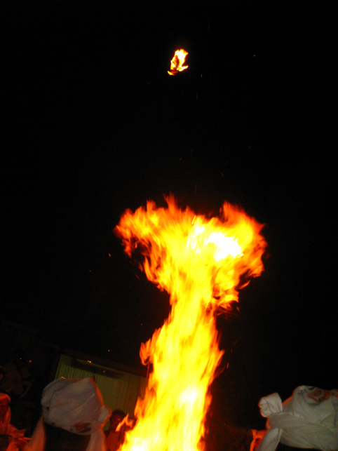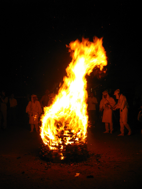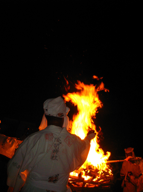 富士塚を下りた行者12人衆は、氷川神社の参道を歩き、 境内に設置された浅間神社の仮宮にて もう一度拝みをします。昨年までは、全員正座をしていたとのこと。膝の痛みを訴える行者が増えたからだそうです。 先達が、お焚き上げのための種火を用意しました。いよいよです。 玉串の向こう側に置かれているのは、竹の箸。60cmほどの長さです。これでお札を挟んで、お焚き上げの火中に放つのです。 焚き上げていただく祈願札は、誰でも納めることができます。 私も願いをこめ、1枚書いてもらいました。 「行者が名前と願い事を読み上げるからね」 「ちょっと恥ずかしいな〜(笑)」 中央の松明に点火すると、乾いた杉の葉はメラメラと火を這わせあっという間に燃え上がりました。 「御願い上げ頼み奉る〜」 まず先達が、ヤマキチ講のお札を竹箸で挟み、読み上げてから火に投じます。 燃えたお札は、火の玉となって上空に舞い上がります。 先達につづき、全員がそれぞれ手に持つお札を焚き上げます。 「おんねがいあげ たのみたてまつる〜。ナニガシダレソレ〜」「おんねがいあげ たのみたてまつる〜。ナニガシダレソレ〜」「おんねがいあげ たのみたてまつる〜。ナニガシダレソレ〜」「おんねがいあげ たのみたてまつる〜。ナニガシダレソレ〜」「おんねがいあげ たのみたてまつる〜。ナニガシダレソレ〜」「おんねがいあげ たのみたてまつる〜。ナニガシダレソレ〜」 燃えた祈願札が高く昇れば昇るほど、願いが叶うと言われます。行者は心をこめ、力いっぱいお札の願主と願い事を読み上げます。 盛り塩は、火力を調整するためのもの。火に投げると少し弱まります。 それにしても、壮絶な火の力。容赦しませんというくらい、火はすべてを焼きつくす。見る者の、心の中の迷いすらも。 滝のような汗を流しながら、12名の行者は力強く願いを言霊に変えてゆく。その声は鈴の音と混じり、すごいパワーを生む。圧巻でした。お寺で護摩焚きを見たことがありますが、その時の何万倍もの感動を受けました。 顔を焼かれ、胸中の暗闇を焼かれ、気づくと私は放心状態になっていました。目から汗も出ていました。 全ての願いを焚き上げて、行者は火のまわりを一周し退場します。 戻って来られた行者のMさんが、 「ほら、こんなに熱くなってる!」 鈴(レイ)を私の手に触れさせてくれました。ずしりと分厚い金剛鈴は、熱と一緒に念を吸ったかのよう。 とにかく金属類はハンパでない熱伝導。同行のカメラマンさんも、カメラが熱くなっちゃって大変だったようです。(そちらの写真は次の本にて♪) 「それからこのお箸!!」 竹箸は、高熱によって彎曲していました。無理はありません。お札を燃やすため、箸ごと火の中に入れるのですから。 お疲れさまでした。離れていてもすごい熱でしたから、火の中に飛びこむほどの位置で読み上げをしていた行者の皆さんは、熱の痛みを体で受けていたのでしょう。それこそ行(ぎょう)として。 それにしても、見事にすべての祈願札を焚き上げられましたね。皆、天に向かって願いが届いたことでしょう。 「お札を書いた人は、自分の札が高く昇ったかどうかとても気にします。ですから、われわれも真剣になるのです」 35年間、このお焚き上げを司ってこられたS先達は、明治18年からつづくこの行事について、いろいろと語ってくれました。ありがとうございました。 人々が去り、静けさが戻った富士塚。 私の感動は、なかなかおさまりませんでしたけど。