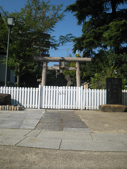 白い柵の向こうに塚はあります。