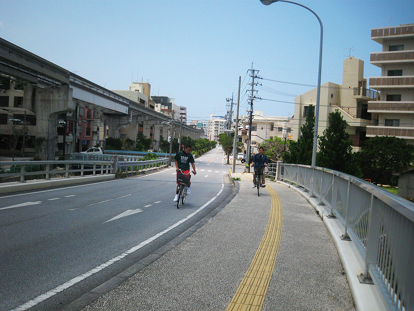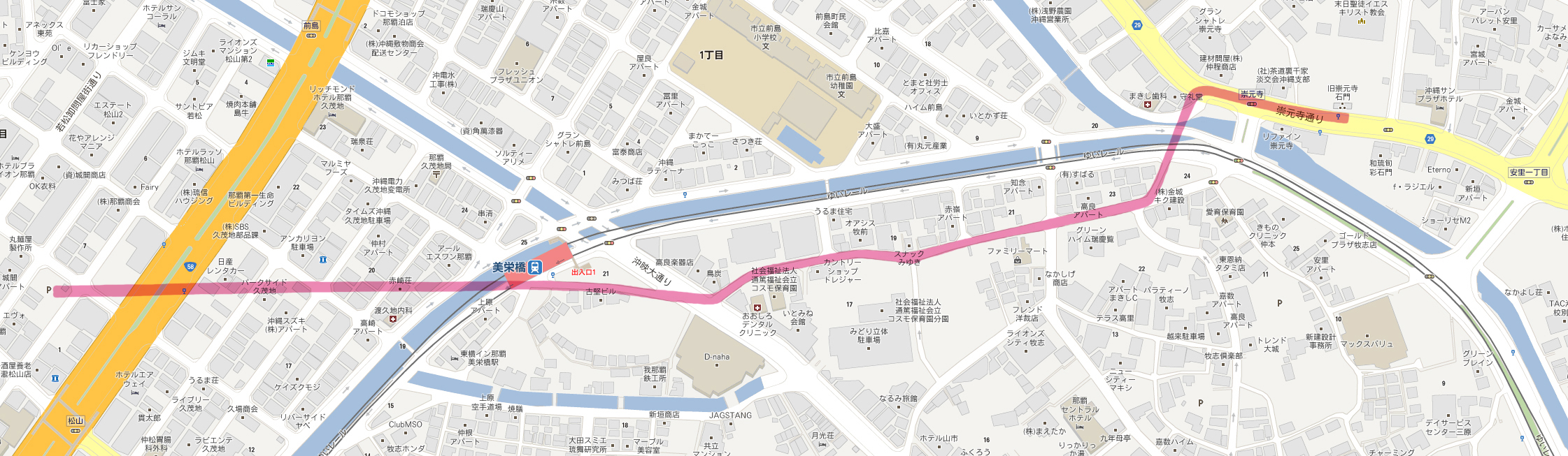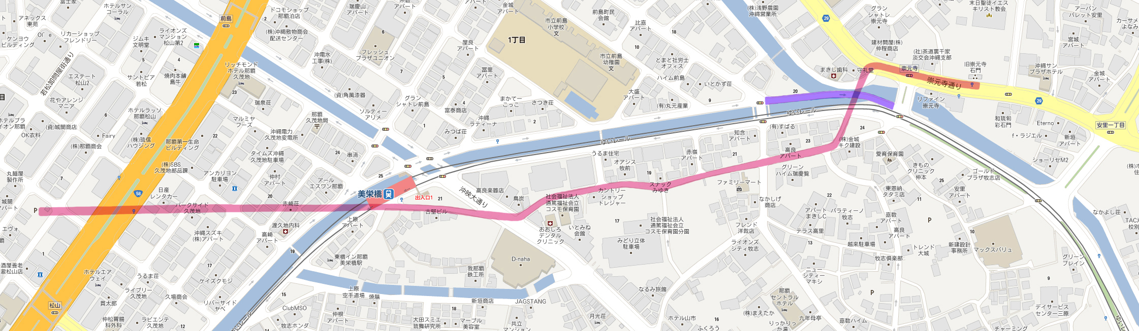 崇元寺(跡)を後にし、 長虹堤を、現在の地図に落としてみました。 ピンクの部分がかつてのルートです。 (現)崇元寺橋は、昔の位置より東にずれているのがわかります。 その近くに「牧志長虹橋」がかかっています。 新しい橋ですが、唯一「長虹」の名がついた場所です。 かつての長虹堤ルートに対して、直角つまり全く無関係の位置 ではありますが、長虹という名を残している意味で貴重です。 「まきしちょうこうばし」 刻まれた幾重もの曲線は、おそらく虹を表しているのでしょう。 ゆいレールすれすれです。 ちょうど、頭上を首里城バージョンの車両が走って行きました。 つづく。。。 Facebook あり〼