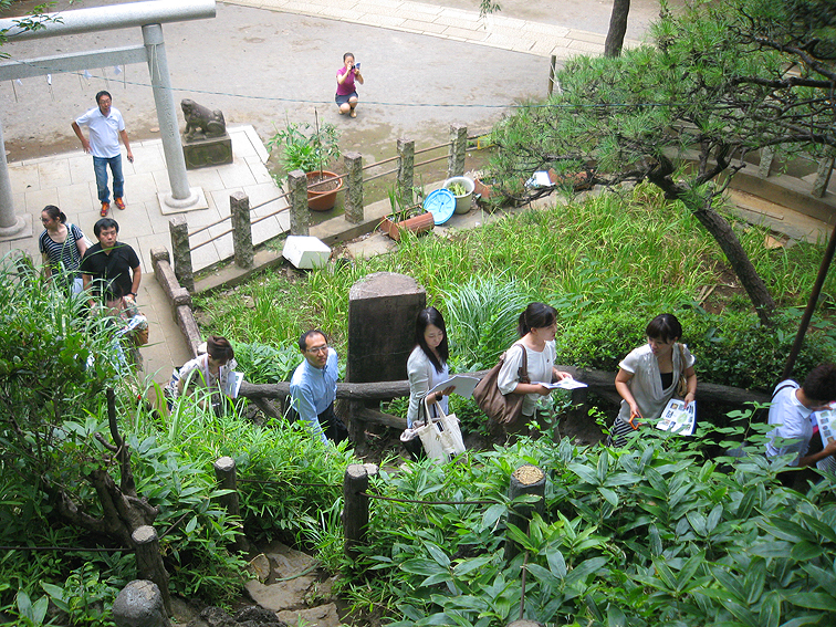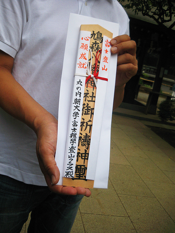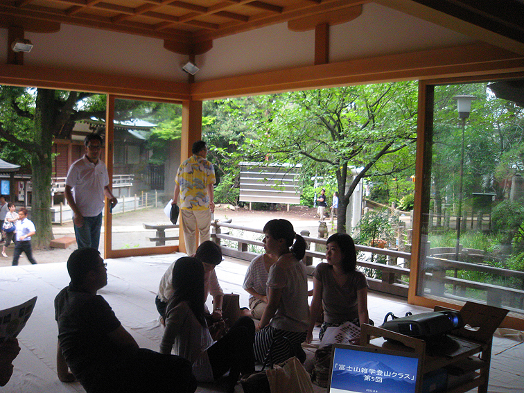 その日は8月8日。末広がりで縁起がよいです! 富士山にうってつけ♪ 丸の内朝大学の「富士山雑学登山クラス」第5回目は、フィールドワークでした。 千駄ヶ谷富士にやってまいりました。 千駄ヶ谷富士は、2種類の江戸切絵図にはこんな風に描かれていて、 江戸名所図会にも! 昔からこの絵と同じ場所に立ち続けている都内最古のお富士さんです。 画面ほぼ中央に富士塚があります。 色をつけて寄ってみると、 こんな感じ。橋を渡って山に入るのは江戸時代から同じ。里宮(浅間社)の位置も変わってない。 能楽殿(かぐら殿と書いてある)の位置も同じですね。 左隣のいなりは、甲賀稲荷とは違うようですが。(明治18年に合祀されたので) ありがたいことに、その能楽殿にてレクチャーをさせていただきました。本当にありがたい! 隣に富士塚を見ながらなんて最高です! 身禄像がこちらを見守ってくれてます。 加藤氏とクラス委員のおふたりが手際よく準備を。ありがとうございました。 続々と受講生の方たちが集まってきました。 30分の座学を大幅に過ぎ(私の熱がこもってつい)、富士塚登拝へと移動しました。 登山道は大渋滞。 そう言えば、今年の開山式でも同じような光景↓でした。若い方が多いですね。 受講生の皆さんは、私から資料を渡されて「あれ見ろこれ見ろ」って 言われていたからゆっくりとですが。それに皆さんは後日本当に富士登山をしますから、 今回は、登山の無事を祈願しての登拝であります。 最後尾を見守っていたら、 Mさんが素晴らしいアロハを着ていたことに気づきました! ず〜〜〜〜っと富士山柄のアロハを探していた私は、Mさんから情報をいただき、 後日ステキな一枚を購入しました(Mさんありがとう!) そして全員が無事下山を終え、 (ここからがスゴイ!)鳩森八幡神社の本殿にて、 神職によるご祈祷を受けました。 ほぼ全員が初登山です。もちろん、全員で安全登山ができますようにです。 ひとりひとり玉串奉奠をし、お神酒もいただきました。 これで大丈夫ですね♪ 富士塚登拝もしたし、強い味方に守られてますから。 皆さんありがとうございました。いい朝をシェアさせていただきました。 きっと素晴らしい登山ができますよ♪ ちなみに8月26日は1合目から5合目へ。9月1日は5合目から頂上へ登る予定。 なんと両日共、火祭りの日ではありませんか! わーわーわー。 (26日は富士吉田の火祭り、1日は清瀬市中里富士の火祭り) 行ってらっしゃ〜い! (↑朝大学で授業の後、仕事に向かう皆さんにかけるコトバでもあります) Facebook あり〼