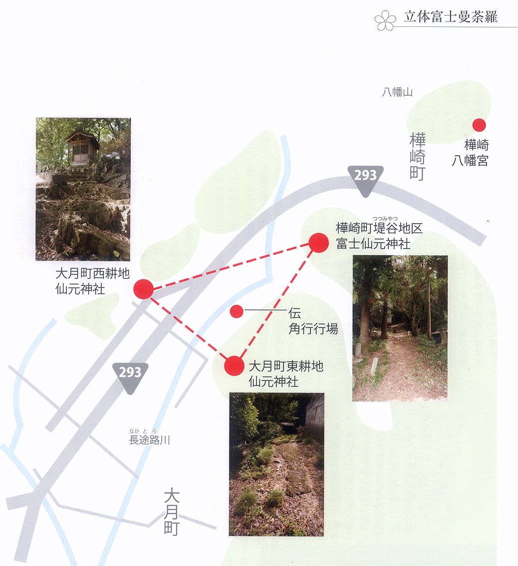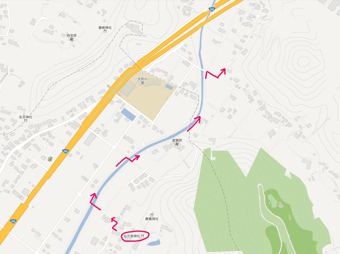 東耕地の仙元宮には、富士山赤御影と水盤のマークのほか、 ふたつの石碑が特徴です。 木の幹に喰われた碑と、バッタンと倒れた塔は、 墓石と言うか供養塔というか。。。戒名が彫られています。 右の石には、「中興開山ゴウクウ妙王光清」と読めます。 中興と言えば、それに続く食行身禄の名を見ることが 多いのですが、ここでは村上光清。 村上光清は、身禄とは別の流れを組んだ村上講のリーダー。 南関東の富士講とはちょっと違う講です。 (ざっくり富士講のひとつに言われがちですが) 村上光清も、富士山信仰の歴史の中で重要人物ですが、 (富士吉田では、今でも地元の人は親しげに 「光清さんが。。。」などと話しています) くわしくはまたの機会に書くとして。。。 この仙元宮には、古い参道があって、舗装道路と平行に 民家脇から続いています。 坂を下りながら、茂み越しに西方向が見えました。 鎮守橋の向こうにセブンイレブンがまっすぐ見える! その先にあるのが、西耕地の仙元神社。 つまり、かつてここから西耕地の仙元神社(富士塚)が 眺められたということでしょう! 坂を降りきって泰明堂整骨院の前に来ると、 (仙元宮登拝の際にはスルーしたけど)この碑があります。 鹿島神社が村社となったのはいつかわからないけれど、 その真向かいに仙元宮があるのは、なかなか気づかれないでしょうね。 ここからの行き先は、 もう一度鎮守橋を渡って、長途路川沿いに北上し、 樺崎町堤谷(つつみやつ)の富士仙元宮へたどり着くこと。 右に「鎮守橋」が見えます。(北側から撮ったところ) それにしても、 「鎮守橋」が、かつて「仙元橋」という名だったとは、 オドロキでした(情報をくださったカフェオレさん感謝です!)。 「仙元橋」の仙元は、もちろん仙元宮を指しているのでしょう。 もうひとつ、 前方の橋を渡ると蜜蔵院というお寺に着くのですが、 この「寺橋」も、旧名は「行者橋」だったとのこと。 「行者橋」の行者は、長谷川角行のことです。 「鎮守」といい「寺」といい、 なぜあたりさわりのない名前に変えてしまうのでしょう。 (富士山)信仰の証が人の記憶から薄れていくきっかけのひとつは、 こんなことも原因だったりするのでは、と思ってしまいます。 さて、長途路川は水量の少ない小川ですが、重要な川。 長谷川角行がこの大月町にやって来て、このあたりに水垢離をした 行場があると伝えられています。 角行が川の堤に桜の木を植えたとの伝承から、2007年に 「長途路堤桜保存会」が発足され、しだれ桜64本が植樹されました。 角行の修行場は、足利市立美術館で催された「足利の富士山信仰」 の図録にあったマップだと、 みっつの仙元宮(神社)を結ぶ線でできる三角形のほぼ中央。 蜜蔵院近辺だと思われます。 自転車の右側がお寺です。 う~ん。この辺ぽいな~。 お寺の北東端に巨木がありましたが、この木の下に来てピン! 「間違いない♪」 図録が示す行場地点より、ほんの少し上流だけど、 巨木の下あたりは、何となく空気が違っていたから。 それに、ここから見える風景(北を向く)は、魅力的でした。 小さな円錐型の山がいくつも重なって、 何というか、安らかな空間をつくっています。 もちろん、角行が修行した当時と地形が変わっているかも しれないし、木だってその後に生えたのかもしれない。 でも、何となくでもこの直感は、信仰の足跡をたどる私にとって、 過去の人たちの想いに触れた充実感がありました。 うん。それで充分。 ちなみに、角行が長途路川で修行をしたというのは、 伝承からして間違いないと思われますが、 足利市公式ページには、別の地点が載っています(p52) これによると、長谷川角行の修行場が袋川で、 利保(かかぼ)になってる!? まあ、穿ったことはここでは流すことにしましょう。 この後、行きたかったのは、 樺崎町堤谷(つつみやつ)の富士仙元宮です。 等高線を見ていただくとわかりますが、 この自然の山、ほぼ完璧な円錐型です。 つづく。。。 Facebook あり〼
