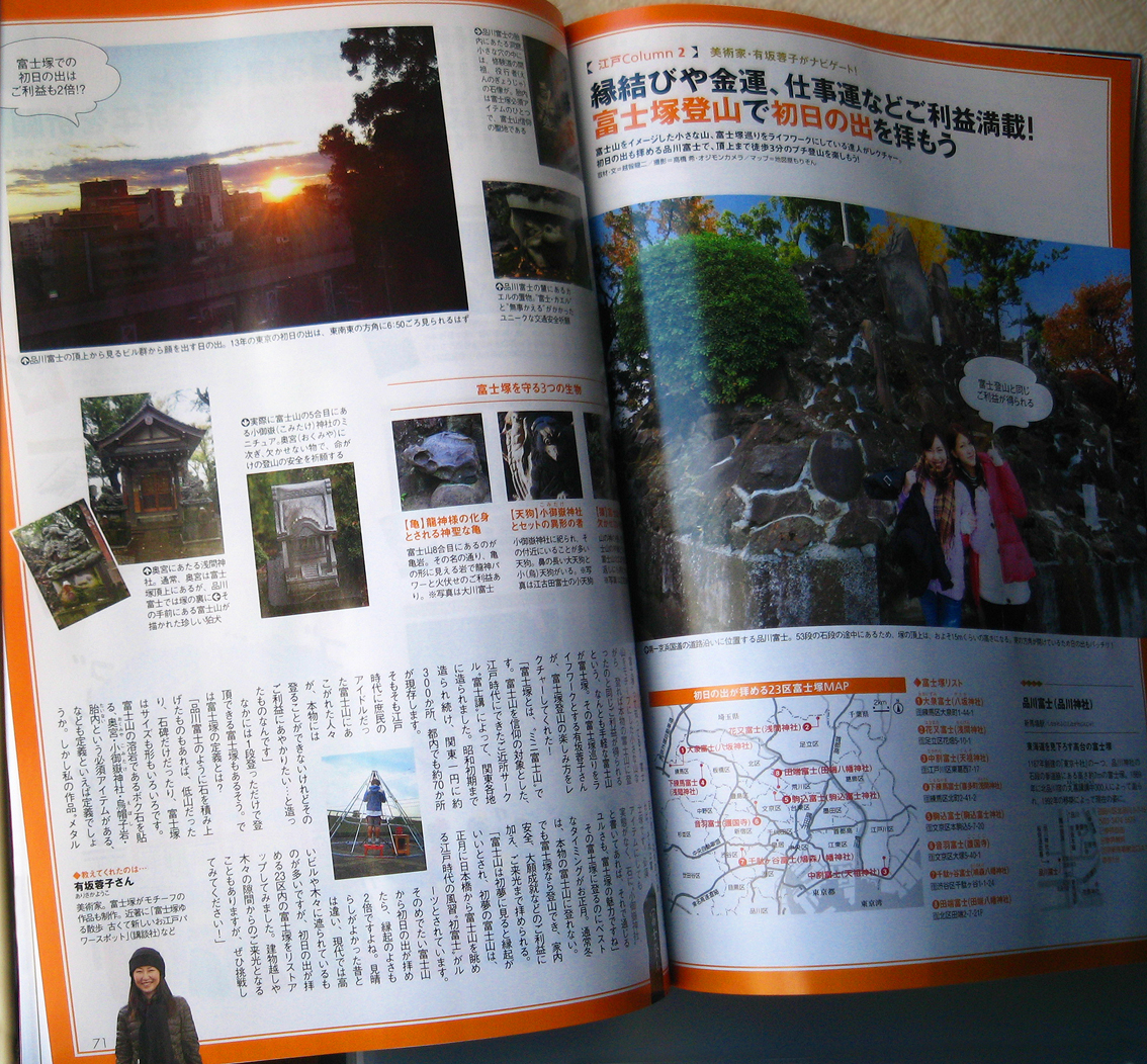 初富士とは、江戸時代、正月に日本橋から富士山を拝むことでした。 (当初は1月3日でしたが、のちに元旦に富士山を拝むこととなりました) では、新年に初日の出を富士山から拝む、となると。。。 これはもう憧れですね。なかなかできないことですから。 でも、それを東京でもできるんです♪ 「富士塚から初日の出拝」をやっちゃいましょう! という企画で、私がナビゲートさせていただきました。 初日を拝める富士塚もリストアップしています。 東京ウォーカー 2013年1月4日号に掲載です。(12月11日発売) ↓ 富士塚記事はp70-71 Facebook あり〼