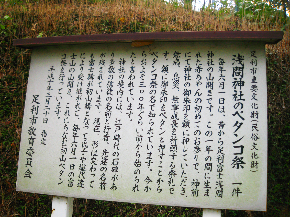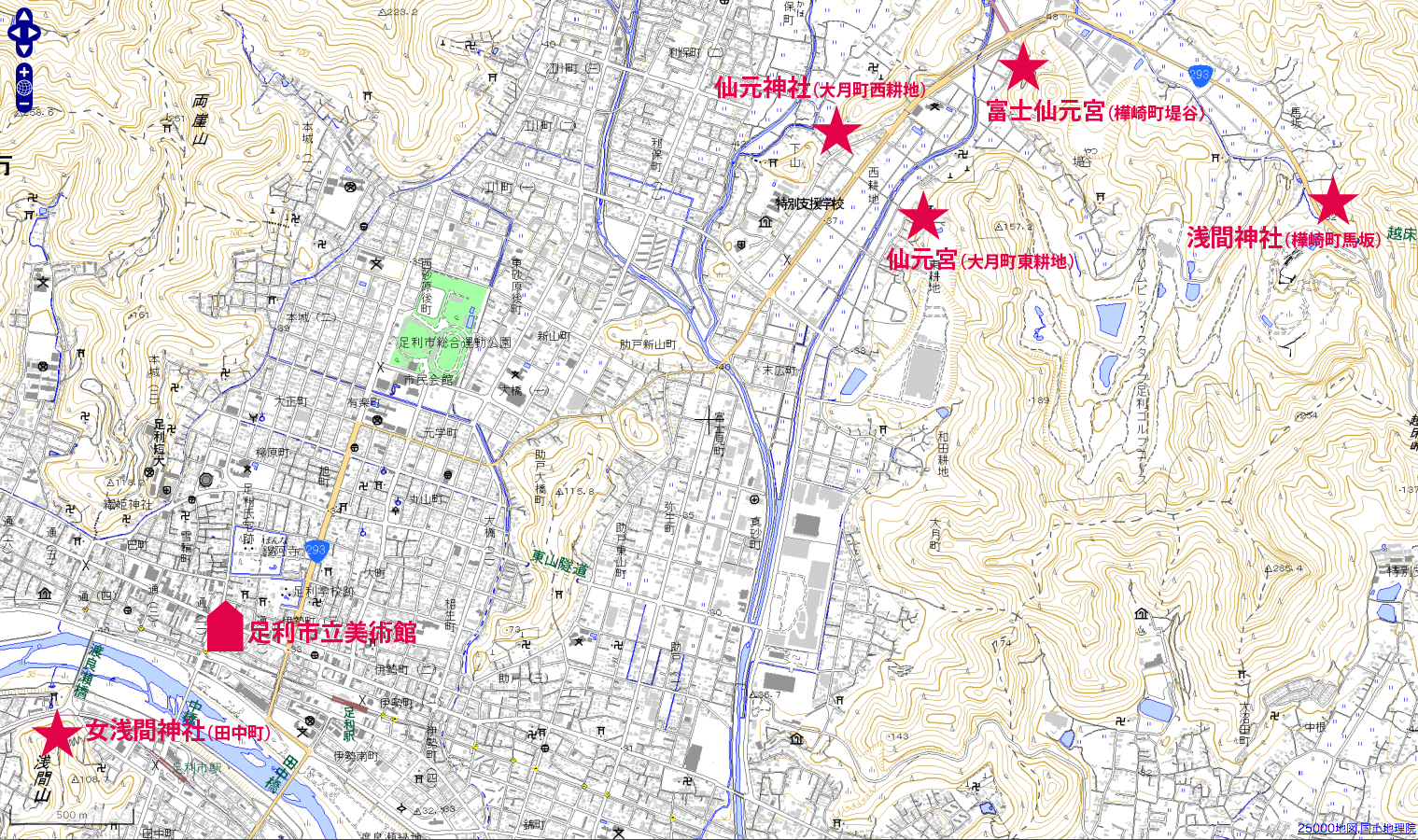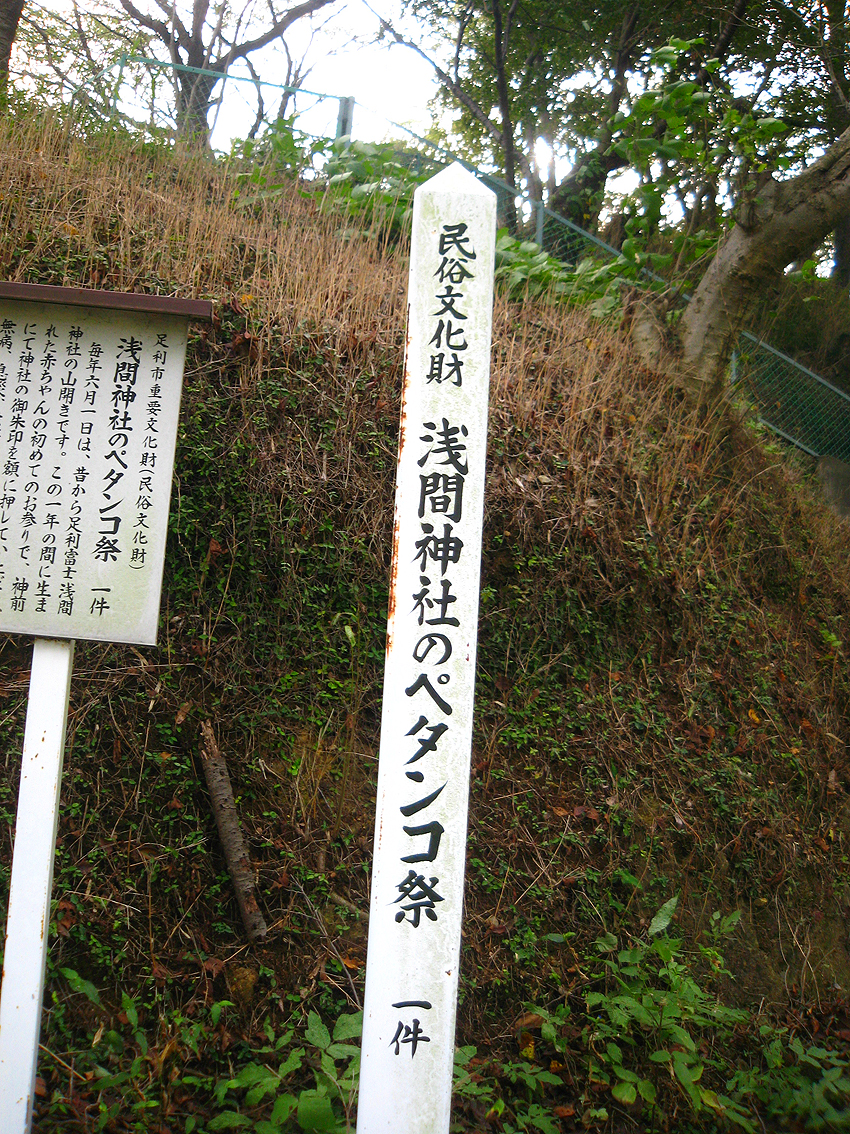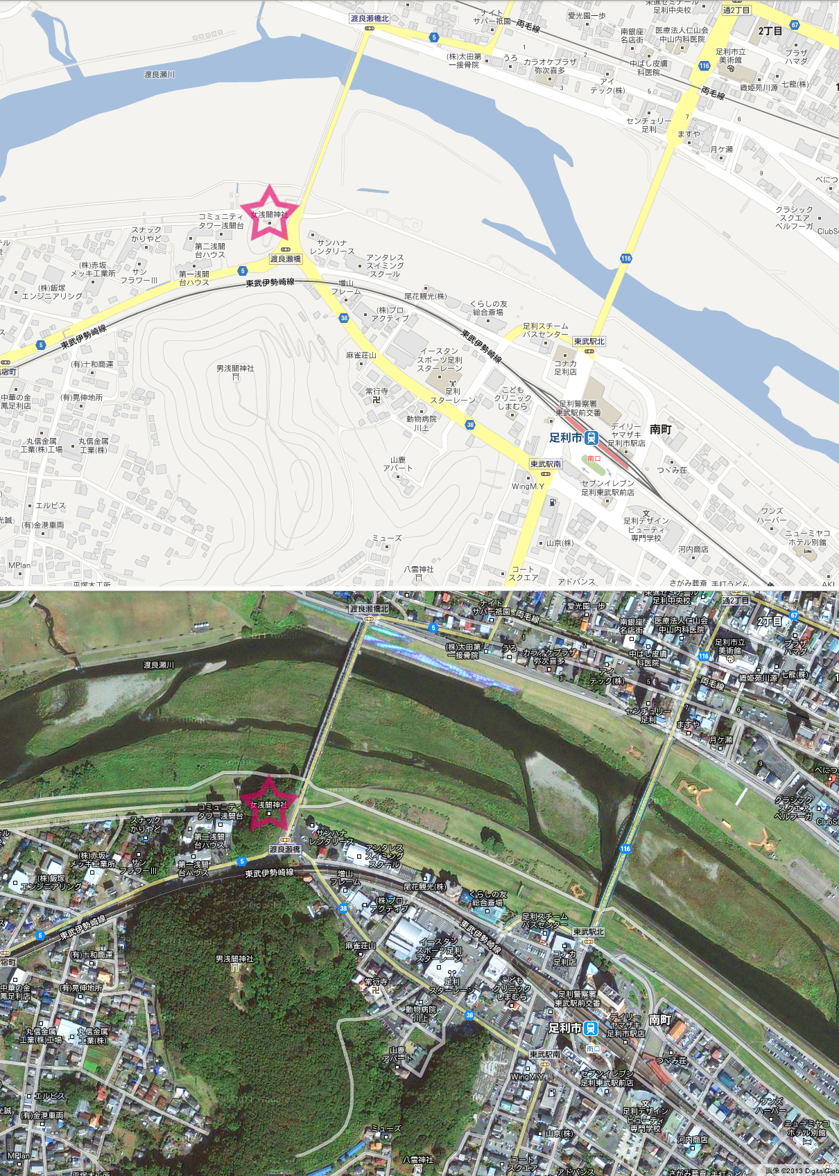 さて、昨年秋に訪れた足利市の富士塚も最後となりました。 もう一度、今回訪れた足利市の富士塚マップです。 樺崎町馬坂の浅間神社から、国道293号を戻りました。 途中、菊屋本店で門前そばを食し(足利はお蕎麦も名物です♪)、 地元で「大日様」と呼ばれる鑁阿寺(ばんなじ)に寄ったり。 境内内の出世稲荷にお参りしたり。 足利学校には泣く泣く寄らずに。。。 市立美術館の横を走り、中橋(116号線の通る)を渡り、 最後にどうしても行きたかった「女浅間」へと急ぎました。 地図と上空写真をセットでアップします。 ピンクの☆マークをつけたところが「女浅間」です。 東武伊勢崎線を挟んで南側にあるのが「男浅間」です。 関東でも有名なこの足利浅間山は、 上浅間として男浅間、下浅間として女浅間。両方合わせて足利富士です。 こちらも他同様に、自然地形の富士塚と言えるでしょう。 かつて「初山祭り」で訪れた男浅間のことは、 こちら や、 こちら や、 こちら に書きましたが、 それらの記事にあるとおり、その時は男浅間しか行けなかったので、 (時間があればのオプションとしてだけど)今回楽しみにしていました。 東武伊勢崎線沿いに自転車を走らせて、渡良瀬橋の交差点に到着。 正面の山が女浅間山です。サインにバッチリと「初山ペタンコ祭」とある! 車道を横断しながら撮った写真は、 渡良瀬川にかかる渡良瀬橋です。左側の橋のたもとに近づくと、 車道の横には、人が歩いて渡れる橋が隣接されていました。 向こう岸、山の中腹に見えるのは赤い社殿の「織姫神社」です。 来た道を振り返ると、 右手が女浅間山。 向こう側に線路があり、その先にそびえるのが男浅間です。 そして、正面を向くと、 浅間神社(女浅間)の登山口となります。では、登山開始。 すぐ目に入る「ペタンコ祭」のサインです。 つづく。。。 Facebook あり〼