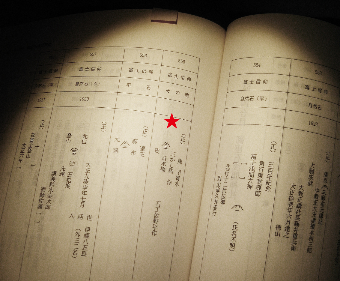 丸の内朝大学の皆さんと一緒に、吉田古道を歩き、 4合5勺にある、御座石(ございし)を拝みました。 御座石とは、神の依りつく石という意味があるとのこと。 あ〜んな高いところに彫ったんですね! 「ほら、日本橋の文字が見えますね」と私。 すると、Tさんが気づきました。 「あれは、鰹節のにんべんの屋号では!?」 おお、たしかに! 日本橋にある老舗、にんべんの商標「イにカギ(金尺の形)」です。 創業者である伊勢屋伊兵衛の「伊」(名字と名前につく)から取った 「イ」(にんべん)ですね。 ちなみに、伊勢屋伊兵衛の本名は高津伊兵衛ですが、 勢州(現・三重県)出身だったので、伊勢屋伊兵衛としたそうです。 御座石に彫り込まれた「にんべんマーク」の下に青木とあるのは、 従業員の中にいた、富士講信徒、青木さんの名でしょうか。 くわしいことはわかりませんが、手持ちの資料、 「富士吉田市上吉田地区石造物調査報告書 上吉田の石造物」 を開いてみたところ、 魚がしに携わっていた(つまり鰹節業つまりにんべん?) 「山三講」の青木という人物らしいことがわかりました。 おそらく、青木駒作さんでしょう。 山三講マークの下の、(右から読んで)「三夜」は 二十三夜講のこと。富士塚で見かける石碑にもよく刻まれています。 石工は佐野平作さんですね。 山三講は、富士講の中でも比較的古い講で、 山口三左衛門なる人物が、渋谷の山吉講から分かれて起こしたもの。 元講は麻布にありましたが、枝講は、赤羽橋(港区)、芝金杉、 堀江、日本橋、新橋と広く、千葉県の館山、富浦、千倉や、 川崎の一部にもあった富士講です。 日本橋の山三講、きっと羽振りがよかったのでしょうね。 そんな気がします。 なんか最近、日本橋に御縁が多いです。 詳しくはそのうちに。。。 Facebook あり〼