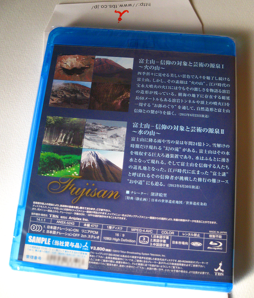 2014年1月1日発売です。目出たき日にいいですね~! 「THE 世界遺産/富士山-信仰の対象と芸術の源泉/Blu-ray」 今年6月に放映された、TBSの番組がまとめられています。 私の姿はありませんが、エンドロールに名前は出てるかと。 未開封です。お正月に母のところで一緒に鑑賞の予定です。 サイトからは→ これですね 今年も御縁に感謝です。 Facebook あり〼