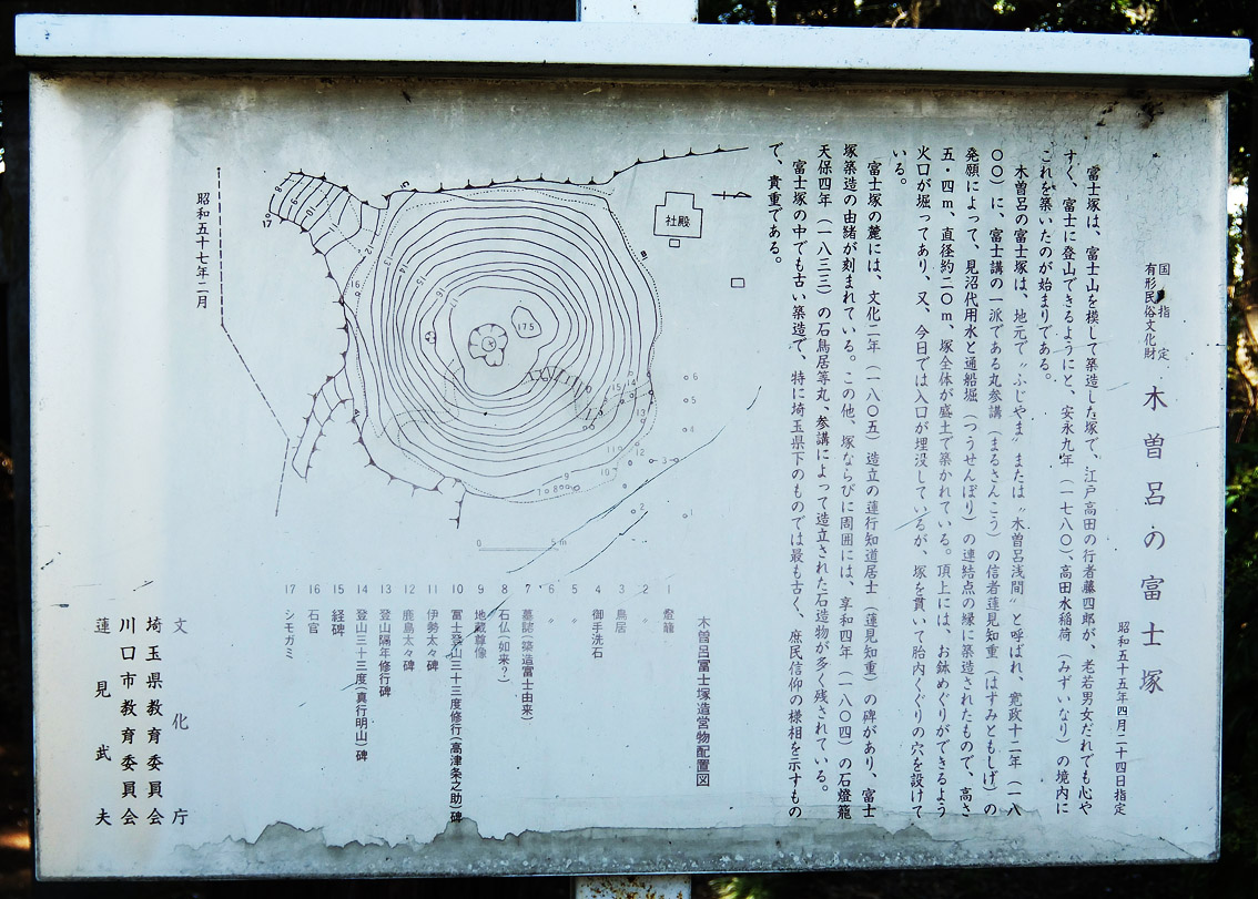 少し前になりますが、桜がらみの富士塚です。 国に指定された、有形民俗文化財の富士塚(4基)のひとつ、 埼玉県の「木曽呂富士」です。 武蔵野線東浦和駅の南から、 見沼通船堀(みぬまつうせんぼり:江戸時代の運河)に沿って 東に向かうと、突き当たり前方に大振りの富士塚が見えて 来ます。(ここまでの道のりは桜並木にうっとりです) 埼玉県にはおびただしい数の富士塚がありますが、 木曽呂富士が最古です。 地形の段差を利用して、東側が中腹の高さ (鳥居や里宮もそこにあり)で、 西側は低い位置まで裾野が広がります。 (東側6m、西側15m) この富士塚の発案をした、蓮見先達の墓碑銘上には大日如来が 鎮座し、そこから塚を仰ぐと、頂上の桜の木に見下ろされます。 頂上はお鉢めぐりができるよう、火口が掘られており (現在はなだらか)、 西を向くと見沼通船堀と、遠方に富士山が見えます。 かつて、富士山の影がこの地にまで移って(写って?) この富士塚となすと言われたとか。 中腹と麓にふたつの胎内(ひとつは人穴?)があり、 昔はつながっていました。 中道めぐりもできます。 ヒミツの相談をしながら、 少年ふたりが肩を並べて中道を何度も歩いていました。 まるでお百度参りのように。何度も何度も。 Facebook あり〼