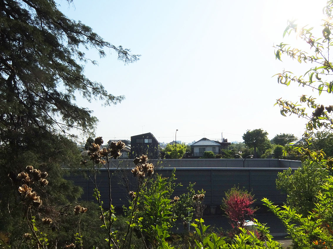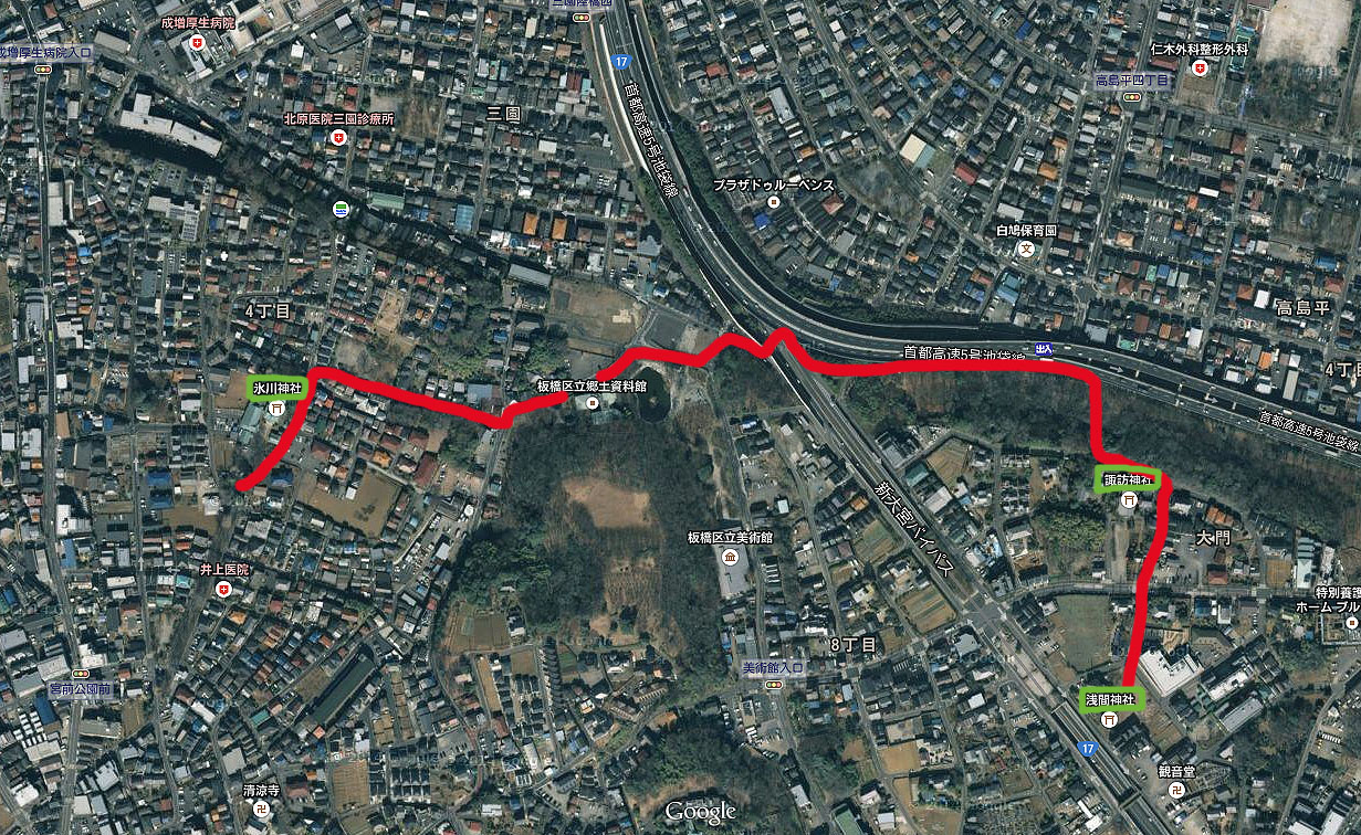 上赤塚富士(氷川神社)から崖線に沿って東に向かいました。 赤塚城跡のある台地(麓には板橋区立郷土資料館や板橋区立美術館あり)の手前、 奈落の底に落ちるかのような、樹木が繁る急な下り坂に吸い込まれます。 台地の端(崖下)には湧水があるものです。 板橋区立郷土資料館の横にも池がありますが、 南下したところにも「赤塚不動の滝」があります。 (東京大仏の近く) 滝は昔から水垢離の場でした。 赤塚不動の滝でも、富士山(や大山)へ出立する前には、 身を浄めたといいます。 富士塚の成り立ちは、(地域にも寄りますが) 武蔵野台地に関して言えば、共通の地形的条件があります。 ●「高台であること」⇒「ミサキの突端」⇒「神の降臨地」 ●「高台であること」⇒「南または南西向き」⇒「富士山がよく見える」⇒「富士山への信仰心」 ●「高台であること」⇒「崖の下には湧水がある」⇒「水垢離に適している」⇒「山岳信仰に密着」 上の条件を満たしている富士塚は、この近くでは 「江古田富士」「白子富士」「大泉富士」などがあります。 (湧水と富士塚のカンケイは密ですよ) 国道17号線(新大宮バイパス)を横切り、首都高速5号池袋線の すぐ南側の森(崖線にあたる)の中を登って、諏訪神社に到着。 田遊びで知られるこの神社の100m南に、浅間神社があります。 もと来た道を振り返ると、横断歩道の向こう側に諏訪神社の白い玉垣が見えました。 錆びた看板は、かろうじて「諏訪神社境内」と読めます。 飛び地なので、諏訪神社の境外社と言ってもいいでしょう。 この奥の、木がこんもりとしているところが富士塚です。 富士塚はかなりのボリューム。盛り土で築かれた塚でなく、 周囲を削って造ったものと言われています。 現在木々が伸び放題で、登山道は鳥居からの一本しか わかりませんが、中腹に積まれた溶岩から判断すると、 中道や他の登山道があったことも想像できます。 鈴原神社(富士山の1合目)、御室浅間神社(2合目)、 御座石浅間神社(4合5勺)、角行や食行身禄碑、日乃御子なども。 特筆すべきは、頂上から富士山が見えること! (すぐ西側のバイパスの外壁越しに) この日はかすんで見えませんでしたが、いつかまた。 Facebook あり〼