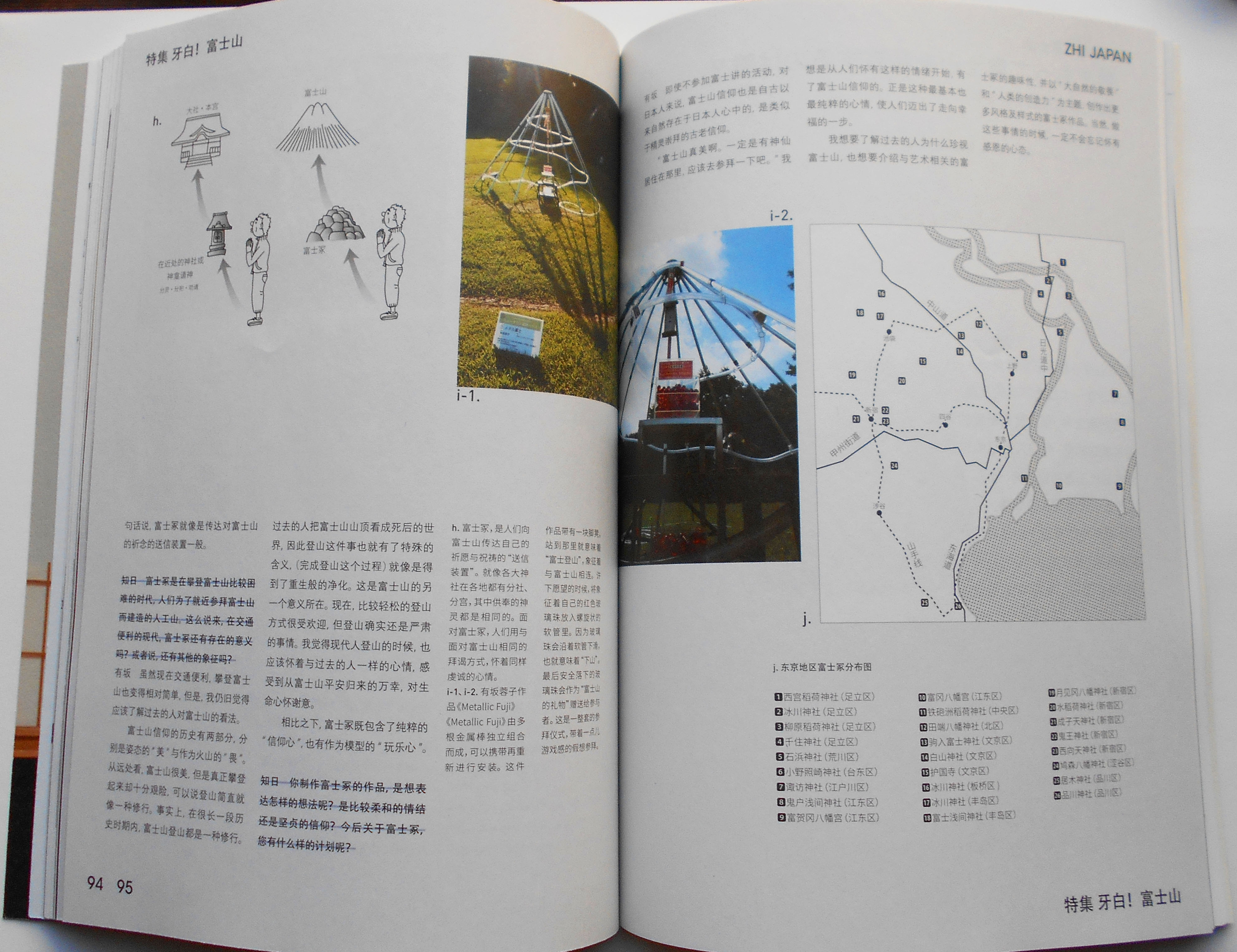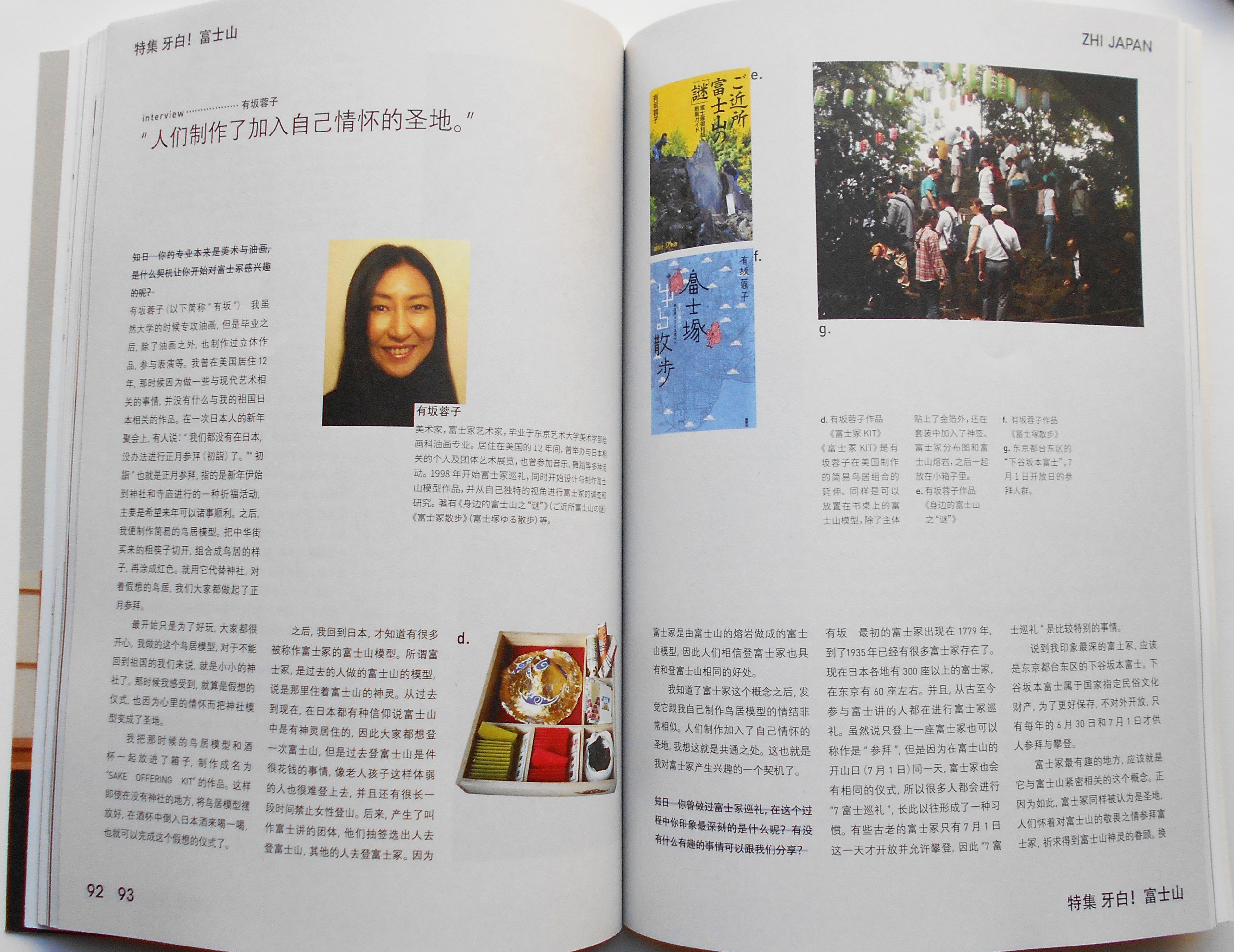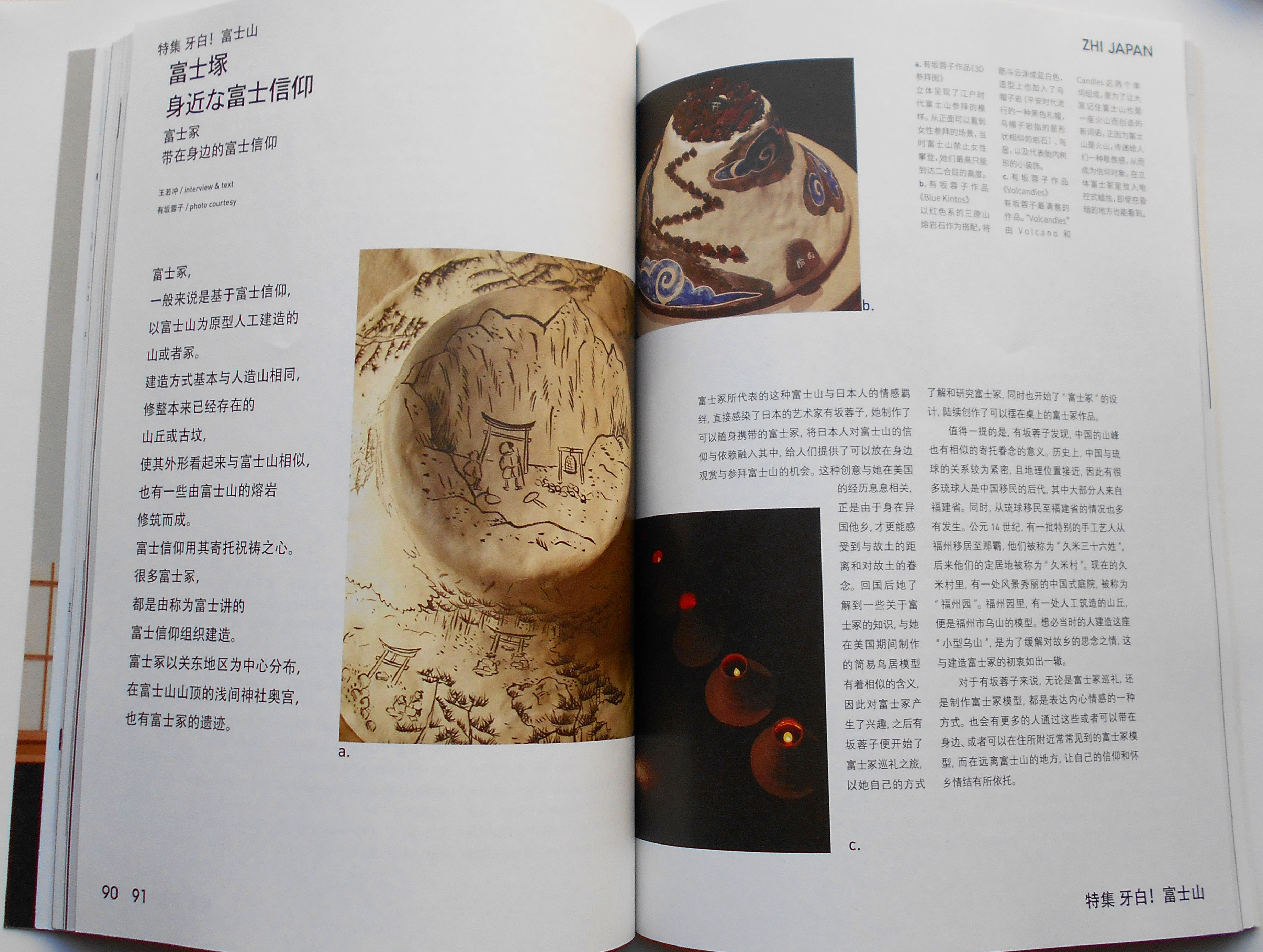 「ヤバイ!」を中国語で「牙白!(ヤーバイと発音)」と言います。 これがつけられた特集は「富士山」です。 知日:ZHI JAPAN 牙白!富士山 「知日」ZHI JAPAN は、中国で出版されているムックで、日本に関する文化(サブカル含む)を紹介しています。今号で28冊目、ちなみに前号の特集は「太宰 治」でした。 優秀な編集人たちによる素晴らしい構成で、富士山を地学的観点からも信仰の歴史や芸術の視点からも、かなり深く掘り下げています。読者は通常の観光客ではないでしょう。 田代 博先生やピーター・マクミラン先生のほか、それはそれは大勢の方が登場しています。御師の筒屋さんの息子さんである小澤輝展氏は、北口本宮冨士浅間神社の神官として信仰について語っています。 で、私は富士塚とアートに関してです。富士塚のどこがアーティスティックか、信仰の域にとどまらないユニークな点が何なのか、紹介されています。中国人にとっての富士塚、那覇にある「ミニチュア烏山」に関してもね。 参考までに、中国語から英語の訳を記しました。 (福建省を英語にするとFujian Provinceになります) p90 Fujizuka: people's Mt. Fuji worship The Fujizukas are man-made mounds made in the image of Mt. Fuji. Methods are in sync with making a mountain, to alter and form an existing hill until it mimics the form of Mt.Fuji. Some are also made from volcanics of Mt.Fuji. Through this, followers of the Fuji regime implant their prayers. Many Fujizukas are constructed by members of the Fuji regime, spreading out from Kanto region as the center; furthermore, traces of Fujizukas also exist at the Hongū Sengen Taisha at the summit of Mt. Fuji. p91 a. Arisaka Yoko Works 《3D Diagram of Homage》 A three-dimensional depiction of the homage paid towards Mt.Fuji during the Edo period. In the frontal view, a female figure pays homage. At the time, it was prohibited for women to climb higher than the 2nd station of Mt. Fuji. b. Arisaka Yoko Works 《Blue Kintos》 WIth the volcanics of Mt. Mihara as a complement, tumbling clouds were painted blue and white, added with eboshi rock (a kind of black topper hat from the Heian period, eboshi rock refers to a lava rock similar in appearance), torii gate, as well as the accessory of womb-like foliage. c. Arisaka Yoko Works 《Volcandles》 Arisaka Yoko's most contented piece. “Volcandles” derived from the combination of the words Volcano and Candles. This new term seeks to remind people that Mt. Fuji is also a volcano, and that this fact in itself remits a sense of awe. By inserting an electric candle in the Fuji mound, it can even be seen in the darkest of places. The Mt. Fuji represented by the Fujizukas are emotionally entangled with Japanese people, and directly enthralled the Japanese artist Arisaka Yoko in creating the mobile Fuji mound, allowing the faith and dependence that Japanese people have in Mt. Fuji to be carried in their pockets, and providing more and convenient opportunities for worship. This kind of innovation intricately linked with her experiences in the United States, as foreign lands exaggerate distances and conjure immense feelings of nostalgia. After returning to Japan, she learned of Fujizuka which had reminiscent qualities of the abstracted torii she had created during her stay in the US. She became interested in the Fujizuka and started her pilgrimage, researching, understanding, and venturing on to the designing of the “Fujizuka,” subsequently created table-top Fujizuka pieces of work. It is worth to mention that Arisaka discovered that mountain peaks in China also have similar meanings of nostalgia. In history, with the relationship between China and Ryukyu being intimate, and their geographical position being close, many people of Ryukyu are immigrated Chinese descendants, with a large population from the province of Fujian. Meanwhile, Ryukyu immigrants in Fujian are also in the large. In 14th century AD, a group of special artisans from Fujian, referred to as the “Kume Sanjuroku-sei,” made a settlement in Naha where the village was, thereafter, named “Kumemura.” Nowadays, in Kumemura, there is a scenic Chinese garden, known as “Fukushūen.” In the garden, there is a man-made hill, modeled after Osan (Wu Shan) of Fukushū (Fu Zhou) province of China. It can be imagined that the creation of this “Small Osan (Wu Shan)” was for the easing of nostalgia of their homeland. The nature of such intent is the same as that of the Fujizukas. To Arisaka Yoko, both the pilgrimage and the making of the Fujizuka are ways of expressing her feelings within. There will also be people who discover support and dependence in the Fujizukas which can be conveniently carried and seen, even in places far away from home and from Mt. Fuji. p92-95 interview …………. Arisaka Yoko “People made Sacred Places Injected with Personal sentiment.” Arisaka Yoko Artist, Fujizuka Artist, graduate of Faculty of Fine Arts, Tokyo University of the Arts, with major in Oil Painting. During her 12-year-long stay in the United States, she hosted many personal and group art exhibitions related to Japan. She has also attended music and dance festivals. She started Fujizuka pilgrimages in 1998 while designing and creating miniatures of Mt.Fuji, and conducted investigations and researches through her own unique perspectives. Authored 《”Mysteries” Surrounding Mt.Fuji》(ご近所富士山の謎) ,《Strolling Fujizuka》(富士塚ゆる散歩), and etc. Zhi Ri : Your major was originally fine art and oil painting, but what inspired your interest in the Fujizukas? Arisaka Yoko (here on after as “Arisaka”) : Although my major was oil painting, after graduation, I have produced many sculptural works, joined theatre