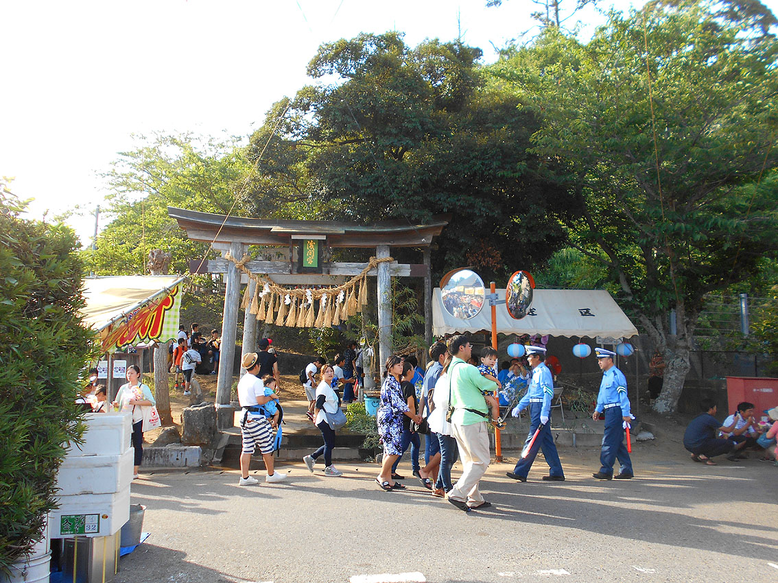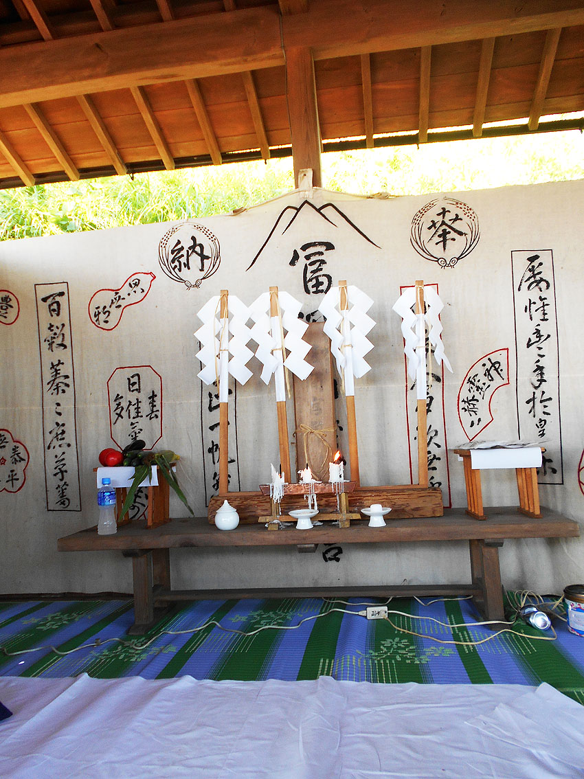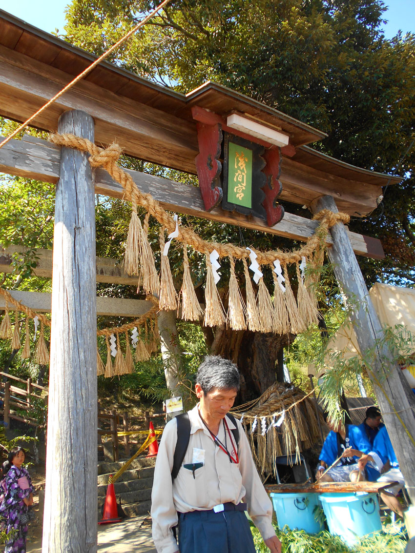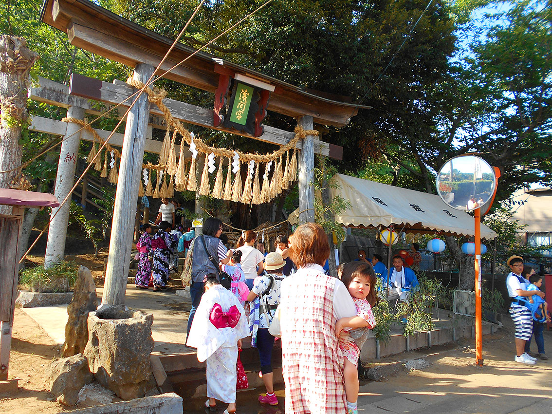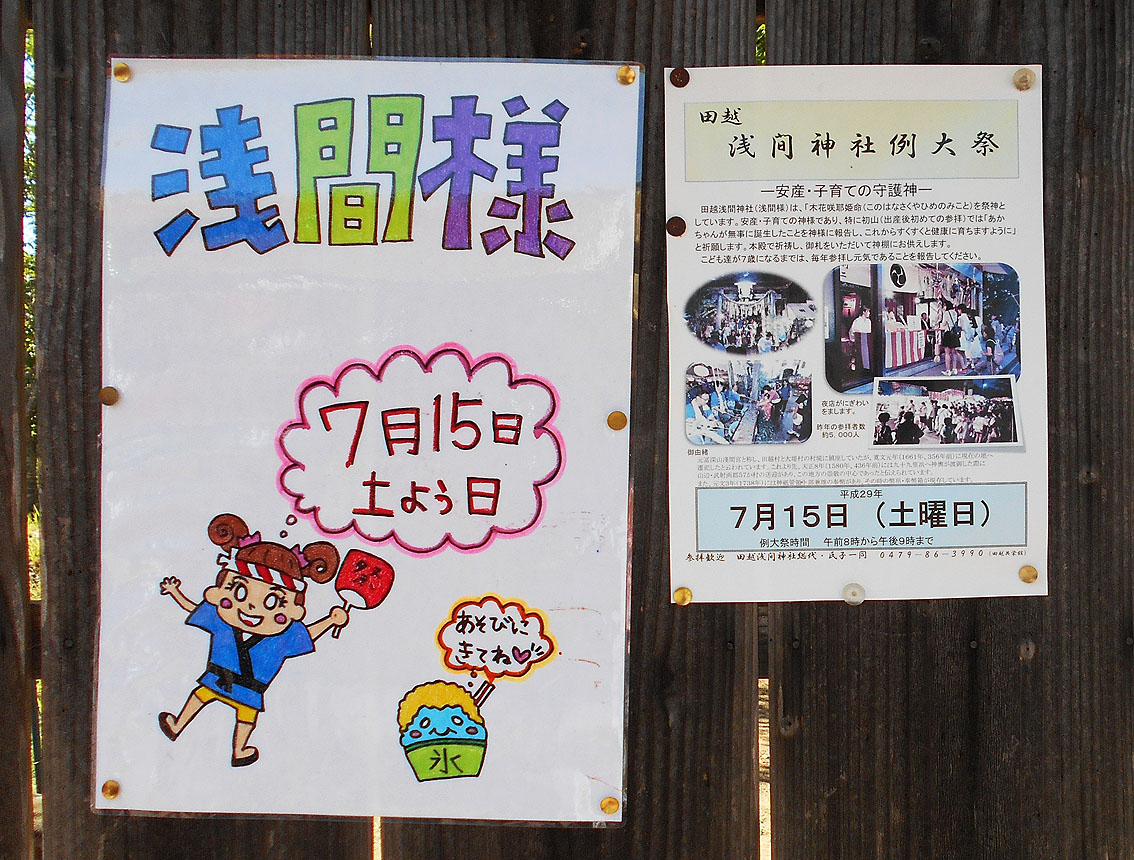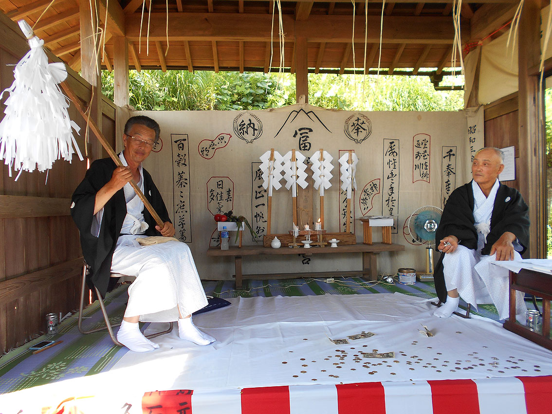 千葉県の九十九里にも初山があります。 総武本線の松尾(成東のひとつ隣)が一番近いです。 車窓からの景色は、延々と田園が続きますが、遠くに低山が見えてくるので、浅間神社である富士塚は、数十メートル規模の自然地形の山だと想像できます。 駅前の商店も最高です!(ちゃんと開店してます) 駅を離れるとすぐに田園です。 ガマの穂を見つけたり、「さんむ田んぼアート」に遭遇しながら歩くこと20分。 とにかく人がいません。。。 誰にも出会わず「祭りは今日じゃなかったのかな」と不安になる頃、 「通行止め」のサインが目に入ります。 低山を右手にしばらく歩いて行くと、 縁日の屋台と、遠くに幟も見えてきました。 ふうっ。ここで間違いない! 幟に「冨深山」と書いてあるのが読めますか? 冨深山でふじさんと読みます。富士山をこう表記するのはおそらくこの地域でしかないでしょう。 お祭り! お祭り! 浅間様のお祭りです! ここは、田越浅間神社。 登山口では青年たちが手水をかけてくれます。これでお清めを忘れる人はいませんね。ナイスです! 登下山道の図もわかりやすく描かれていました。 登山口の左右には、左:「浅間神社」と右:「冨深山」と刻まれた石が。 登山道は登りやすいがなかなかキツい。 「お年寄りや体の弱い人はここでも拝めるように」と、途中に里宮の拝殿があります。 氏子総代の方達から御神酒をいただき、お祓いしていただき、頂上へ行く人は「行ってらっしゃい」と声をかけられます。 白い幕の中央にあるのは、富士講の紋ではなく、三峰のマークの下に「冨深山浅間宮」と書かれているのです。 では、行って参ります。 里宮を後にし、 しばし頂上を目指します。 「もうすぐ? 」「うん!」「あ、ちがうちがう、下山道から入っちゃだめだよ」 (私をはさんで親子の会話) そうそう、ここが頂上の奥宮です。 頂上は最高のビューです!海が見えています。 涼風が気持ちいいですが、初山なので「団扇」です! ここは千葉なので、日本三大団扇のひとつ「房州うちわ」です!(柄が丸い) 子供を連れた家族が本殿にお参りします。 本殿の中に入らせていただきました。 ここでは額の御朱印はありませんが、神職による大変丁寧なご祈祷を授かります。 御朱印の代わりというわけではありませんが、指で御神酒を赤ちゃんの額につけるという、興味深い動作を拝見しました。(やはり眉間はパワーが入りやすいところですよね) ここでは、お子さんが7歳になるまで毎年お参りしましょうと言われます。 そういえば、各地の初山でも「7歳児まで」と言っています。そのわけを神主さんに尋ねたら、こうおっしゃいました。 「7歳までは神様ですから」 神輿が祀られ、極彩色かつ茅葺き屋根の本殿は、かなりの迫力です。 お世話になりました! 素敵なところでした。また訪れたいと思います。 Facebook あり〼