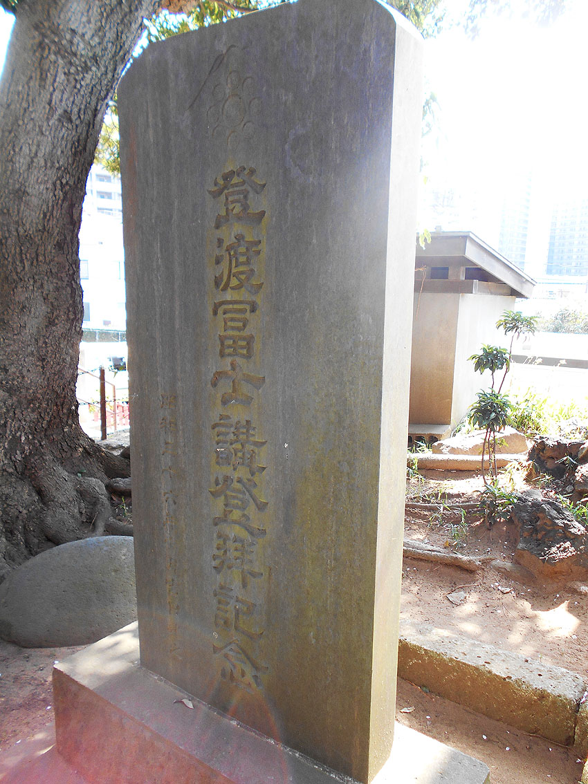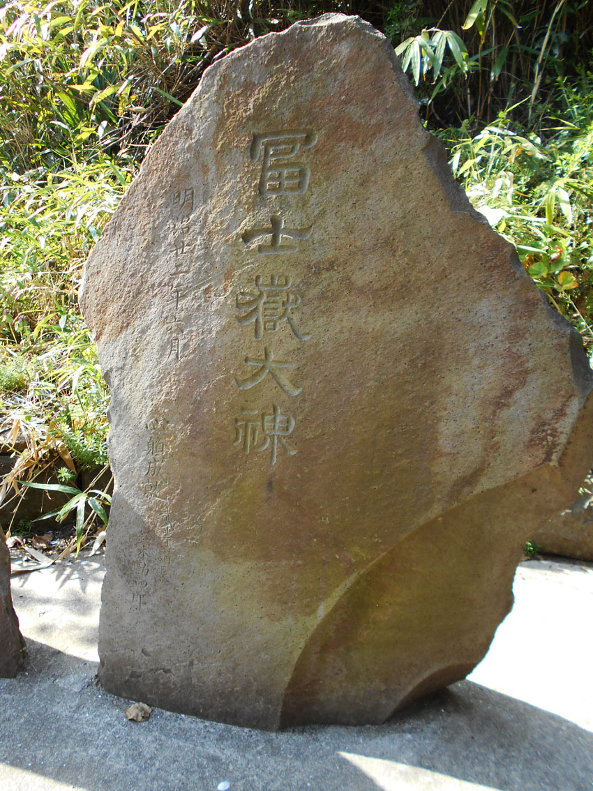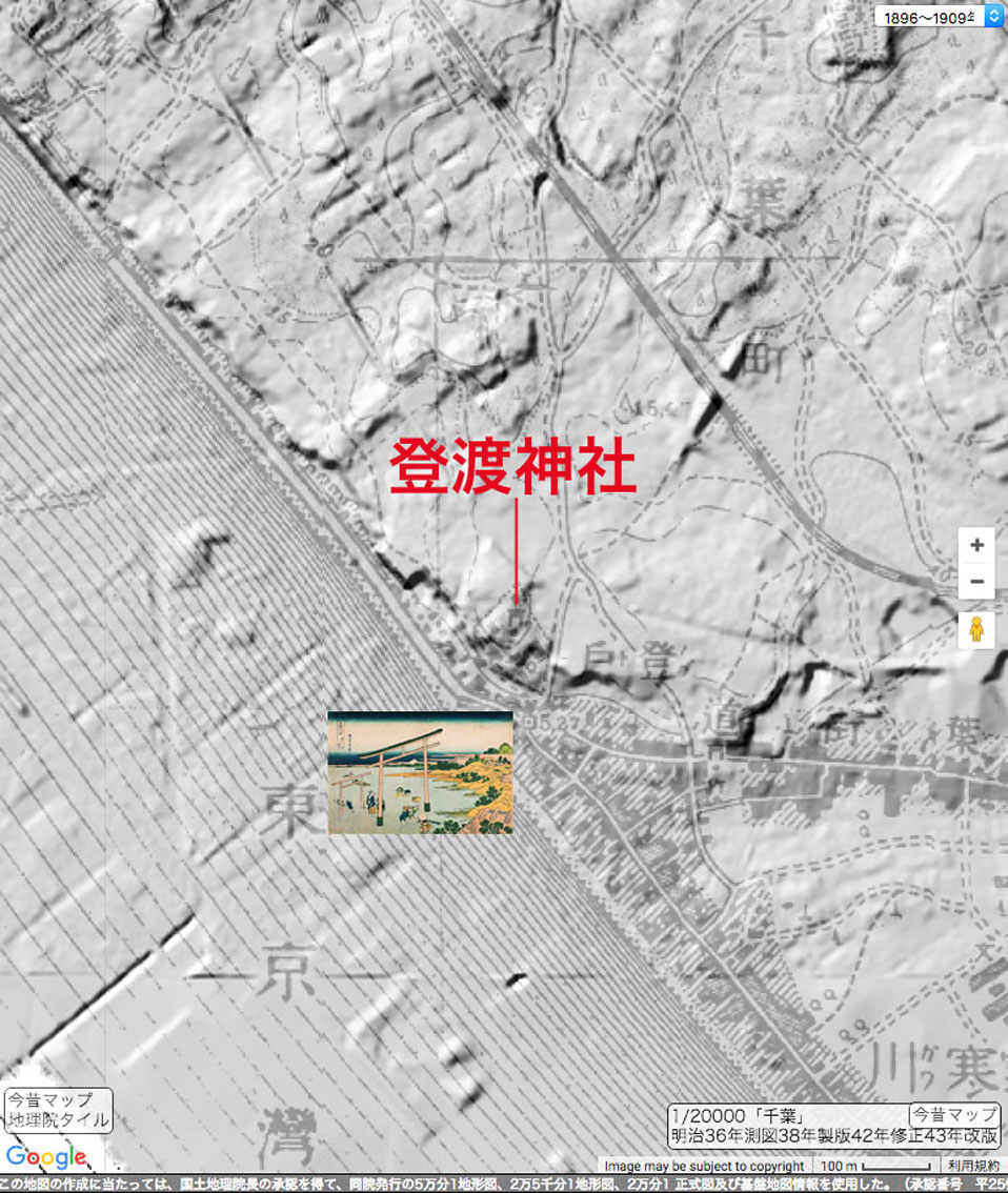 葛飾北斎が描いた冨嶽三十六景の一枚「登戸浦」。 内房の千葉湊から眺めた富士山を描いたものです。 富士山をまたぐ鳥居は、海岸沿いの「登渡神社」のもの。神社名は「とわたりじんじゃ」ですが、登戸(のぶと)という地名から、地元の人には「のぶとじんじゃ」で呼ばれています。 千葉市中央区は、埋め立てが進み、現在の海岸線は遥か沖にありますが、明治時代はまだこんなでした(白黒マップ参照)。高低差から、神社が崖の上にあるのがわかりますね。 もうひとつ、松井天山の描いた「千葉市街鳥瞰図」(昭和2年)にも、「登渡神社」が描かれています。 ということで、「登渡神社」に行く。 境内社として浅間神社はあるものの、富士塚は見当たらない。 やっと見つけた石碑2基。富士山の方角に向かって立っています。 ひとつは「浅間大神」、 もうひとつは、「登渡富士講」と刻まれていました。 でも、あると思っていた山水講の文字はなく、三峰に九曜紋(千葉氏の信仰は妙見大菩薩です)があしらわれていました。 富士塚を探しながら社殿裏の山を観察。よく見ると、社殿と裏山の境目に多数の石碑があり、「富士嶽大神」の文字が目に入りました! 富士塚に建っていたものに違いない!! 神社の方にたずねると、2年前の改修時まで裏山は開放していたとのこと。山の上から浅間神社の社を境内に降ろし、その際に、講碑をコンクリートで埋め固めたらしい。 許可をいただいて撮影しました。小御嶽神社や烏帽子岩もあります。 裏山にも入らせていただきました。石段を登りきると、遥拝を目的とするような頂きがありました。山頂に山水講の文字が刻まれた碑があるはずですが、急いでいたので撮り忘れました。残念! 「登戸富士」と呼べると思います。北斎がもう少し広範囲に描いていれば、この作品「登戸浦」にも富士塚が入っていたのです。 ちなみに、現在山水講はありませんが、「登渡神社富士登拝の会」が毎年富士登山をしています。現在の富士講(=登渡富士講)と言ってもいいでしょう。富士塚は彼らが受けついだわけですね。 ★北口本宮冨士浅間神社のサイトには、千葉市の「登渡富士講」が「現在も活動している富士講」として載っています。 Facebook あり〼