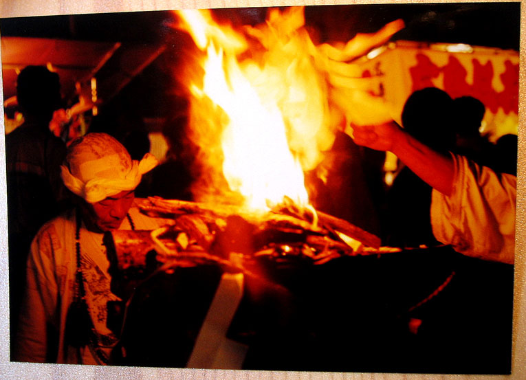 御師、菊谷坊の前の松明では、富士講の人たちが集まっていました。