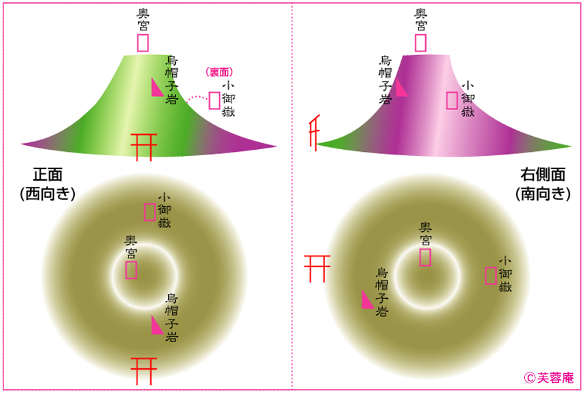 イラスト左は、西側から正面を見た富士塚の図。