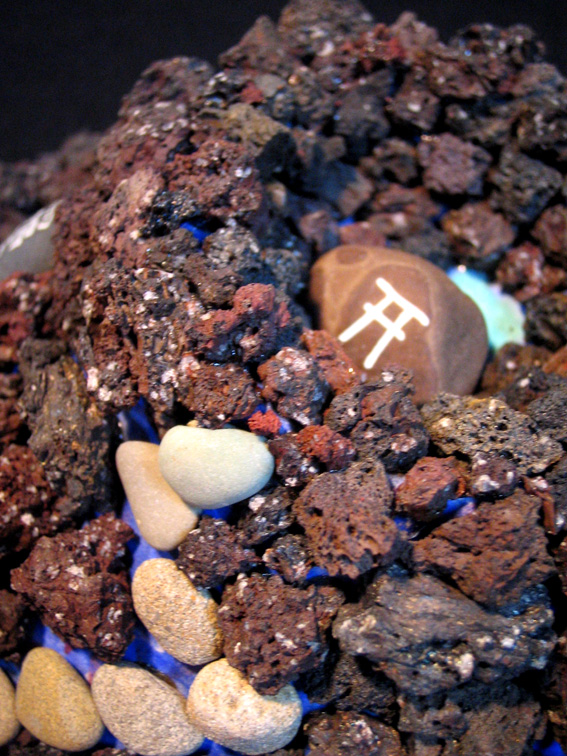 「胸付き八丁」を登るとようやく頂上に這い上がる。。。がんばれあたし!!!!! 失礼しました。。。。自分が富士登山をした時をつい思い出してしまいました。 最初の頃は、溶岩を使って、より富士塚に似たものをつくることに熱中していました。溶岩の接着も容易ではありませんでした。ええっと、これは奥宮の背後に「金明水」をあしらいました。左奥に見える石は、七合目五勺の「烏帽子岩」をあらわしています。 全体の大きさは……直径約40cmです。 現在このテはつくっていません。もっとモダンでデフォルメしています。 富士山、いや富士塚は、ある理論に基づいていればどんな姿も自在です。 つづく。