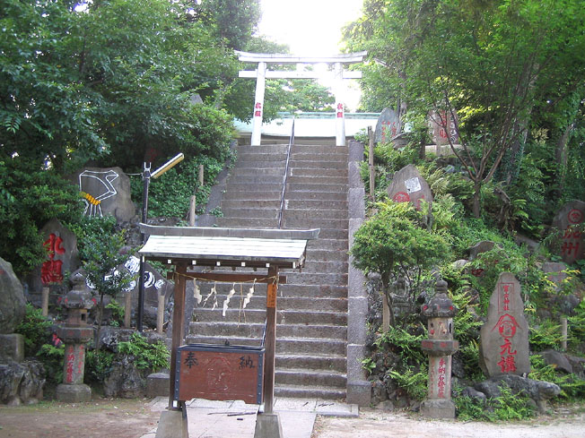 祭りのため、町内のため、という印象の石碑の乱立の様子はよく画像で見てました。のでさらっと。まあ、赤い文字はケバさがいいです。石碑全員が主張していて笑いが出ます。階段が急すぎるので、お年寄りのために下でも参拝できるようにしてあるようですね。