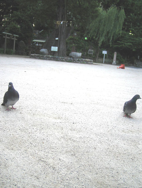もう一度、全景を把握しようと表にまわった。自転車を乗り回していた少年たちは、山に登って来てその後撤収しました。さあてそろそろ私も撤収だなと、広い境内でぼんやり立っていたら、2羽の鳩がひょこひょこ寄って来ました。思わず「帰っちゃダメなの?まだ見るところがあるの?君はダレ?」なんて聞いてみた(笑)。なかなかそばから離れない。人に慣れているんでしょうね。写真を撮ったら踵を返し、去って行きました。。。