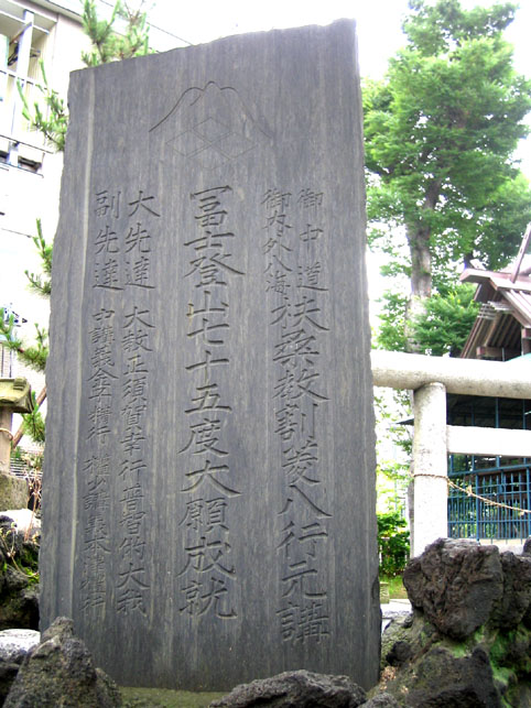 大大先達のなせるわざ、とでも言いましょうか。いや、百数十回の登山歴を持つ人もいるから、このくらいは当たり前かも。この講は「割菱八行元講」といいますが、その上に扶桑教と刻んであります。ってことは近代に作られた碑ということがわかります。明治になって政府が神仏分離令を発し、修験道を禁止したりしたんですが、それまでの修験者を神職につかせたり、密教系仏教に所属させたり、霊山を神社化したりとムチャクチャなこと強いたのです。で、富士講はというと、教派神道として○○教、□□教としてなら認めるってことになった。扶桑教はそのひとつってわけですね。