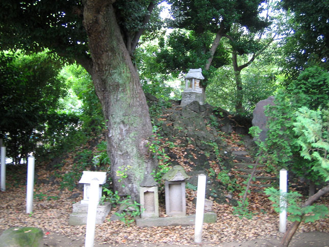 本殿の奥に進むと、濃い樹木につつまれた別世界が広がっていました。高さ2mほどの小さい塚が、大切に守られている感じがしました。その空間は木々が息をしている豊かな森でした。「登山講」という、明治には絶えてしまった富士講によってつくられた塚ですが、他にはない特殊な印象を受けました。通常、講が解散すると、所有者の神社もそれほど管理に力を入れません。荒れない程度に掃除はしますが、やはり「無人」の虚しさはぬぐえないのです。しかしここは、無人ながら生きている!?看板を立てたり白い鉄柱を埋め込んだりしているのに、何かの息吹きを感じるのです。なぜだろう。。。