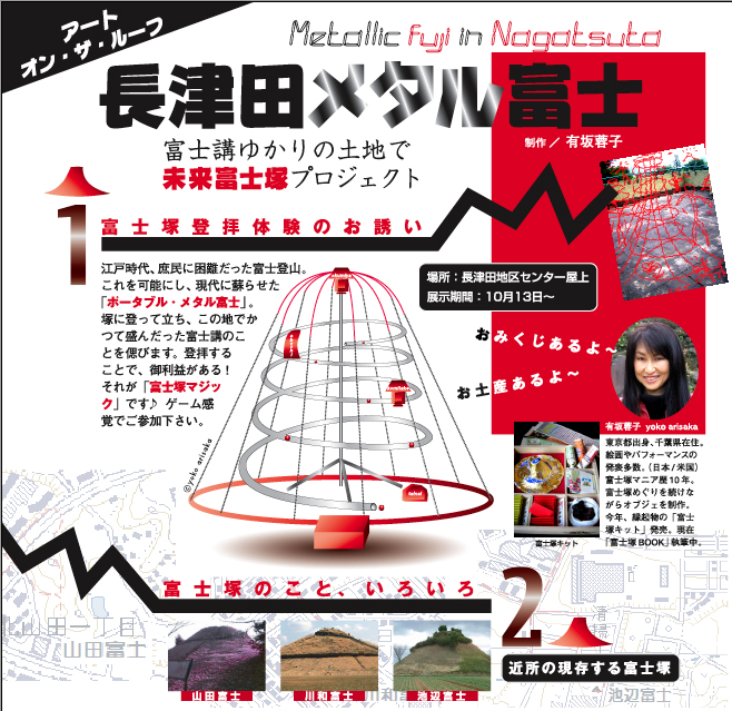 横浜市緑区長津田にて、「メタル富士」を作っちゃいます。 かつてそのあたりは富士講が盛んだったんです。横浜市は川崎市同様、東京と隣接しているため、神奈川県内でもっとも強く富士講の影響をうけました。東京の富士塚とは違い、このあたりは多摩丘陵をうまく生かした富士塚が多く造られましたが、今はあまり残っていません。しかし、土地は記憶しているはずです。富士塚の建てられた頃の富士山の縁起と御利益を♪ 【富士講ゆかりの土地で未来富士塚プロジェクト】 こんなコンセプトで、ビルの屋上にてインスタレーション・アートをやります。せっかくなので昔とは違うマテリアルで、かつポータブルな作品を期間限定で設置いたします。 制作者は、有坂蓉子で出ています。 場所:長津田地区センター屋上(地図参照) 展示期間:10月13日(土)〜11月 2日(金) 登拝体験:10月13日(土)午前10時〜午後3時 設置期間は3週間。でも、面白いイベント「登拝体験」は10月13日のみ! 午後3時までですから、早めにいらして下さいね。