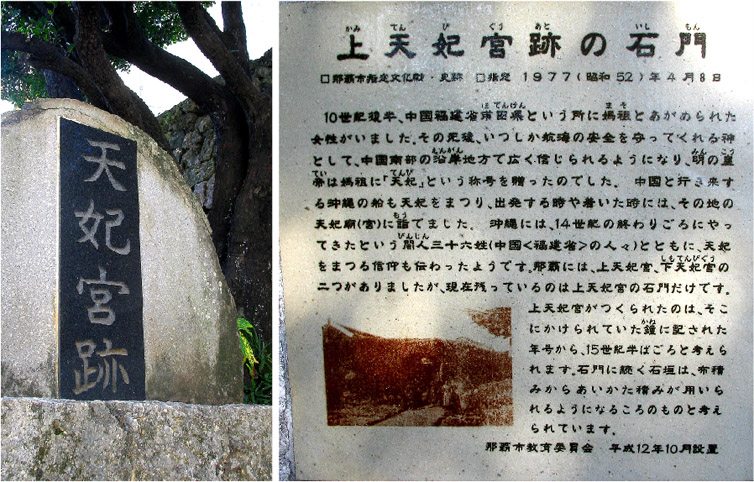 石門の左側にある「天妃宮跡」の碑と、説明のサインです。那覇市の文化財に指定されています。 かつて天妃宮は上下の廟があって、ここは上の廟、このすぐ南西に隣接して下の廟があったようです。跡地は天妃尋常高等小学校が1899年(明治32年)にでき、戦後一時期、市役所として使われその後現在の天妃小学校となりました。 ところで。。。 ミロクもそうですが、媽祖も救世主として【今の時代にこそ人々に求められる存在】であります。 航海安全の神であり、やがて祈願全般に崇められるようになった媽祖は、元々天候を予知する霊力を持っていました。人々に「今こそ」と求められるのは、異常気象を鎮めてほしいとの想いからです。特に水に関する気象。東南アジアを襲った大津波、米大陸で被害をもたらしたハリケーンなどなど、世界で水が暴れています。潮位が上がって国が沈んだり洪水の憂慮もあります。近年、シャーマンたちも媽祖の存在に着目しているそうですよ。 しかし媽祖様の力を借りて……というより、このGODDESSの存在を通し人類が改めなければならないことに気づくべきですよね。