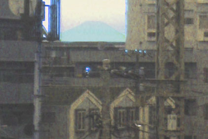 かなり引っぱってしまいましたーーー。ごめんなさい。 はい。富士塚から富士山を「遥拝」した一瞬でした。 でも実は。。。↑コレ、ダミー画像です。 あまりに嬉しくて、写真を撮るのを忘れてしまったのです! だって、何十回も富士塚に登っている私が、富士塚から富士山を望めたのは この時がハジメテだったからであります。 でも、流山富士の頂上で、ビルの間から遥かに見えた【ホンモノの富士山】は こんな色でした。 昼間だったので、まわりの風景はずっと明るいですが、 富士山のブルーはこんなトーン。 ああ、これでやっといにしえの人の気持ちがわかった! 去年、江戸川をはさんで東京都の篠崎富士に登った時に想像はしていましたが。 「富士山が下に見えたよ♪」とは、 富士山をあがめながらと同時に、富士山山頂に立つという贅沢な感覚ですね。 ところで、あの時どなたかカメラにおさめた方はいませんかー?