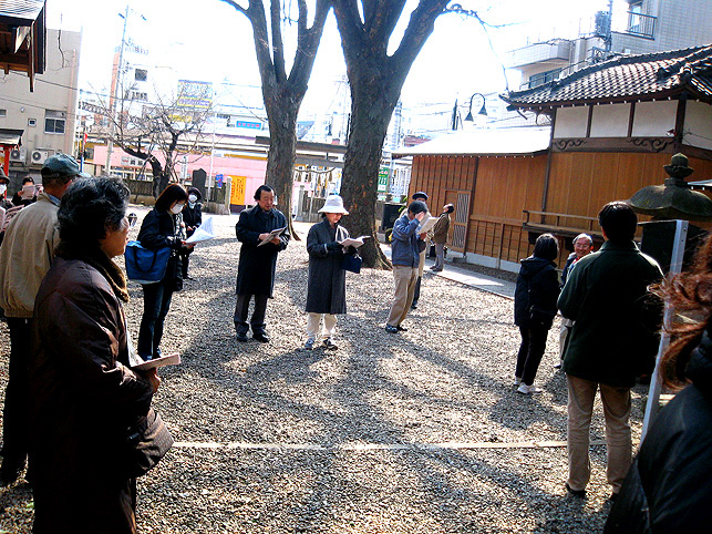 「関東地方の山岳信仰と講集団」の講義の2日後、再び西武池袋線に乗りました。 この日は「江古田富士見学会」という課外講座です♪ 講師の先生はいませんが、郷土資料室の学芸員の方2名と一緒に、江古田の富士塚へ登ります。 江古田の(江古田生まれの私はエゴタと呼びますが)駅前に茅原浅間神社があります。 社殿の奥に富士塚がそびえています。集合時間までまだ余裕があるので、人はまばらです。前夜の大雨もすっかり上がり、ぽかぽかいい天気♪ 浅間神社本殿にお詣りしました。拝殿の奥がガラス張りになっています。写真ではわかりませんが、このガラス越しに富士塚がよ〜く見えるようになっています。 そうこうしているうちに、参加者が集まって来ました。定員30名様。