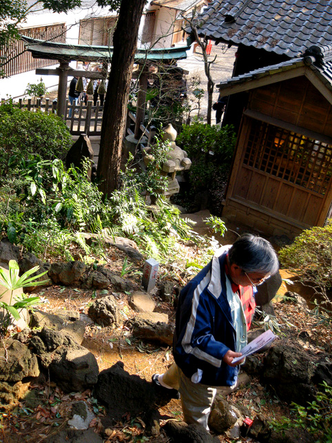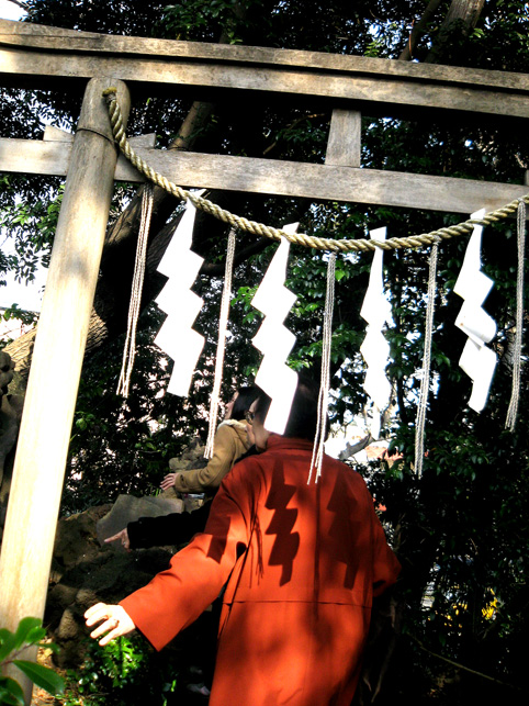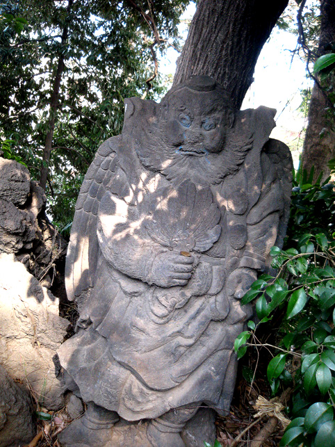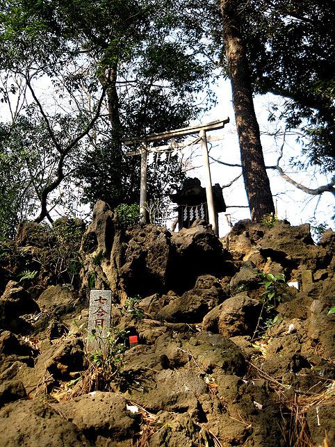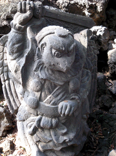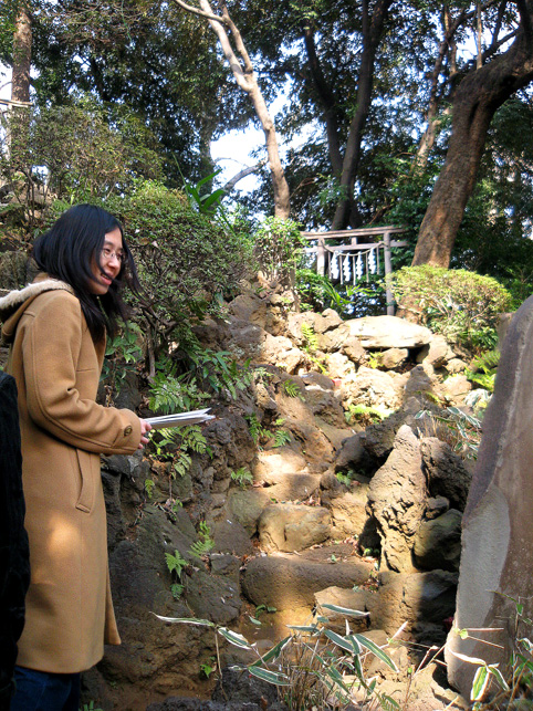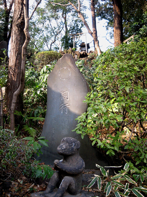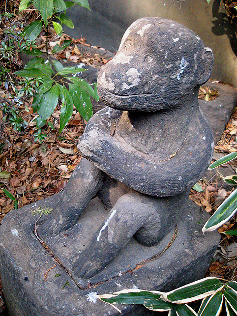 ではさっそく、15人ずつ2班に分かれて登拝へ参りましょう。案内人は学芸員のKさん。 門を開けるとすぐ……変わらぬ姿の猿の像!(私のお気に入りです。笑) こんな位置関係。後ろに「同行=どうぎょう」の大きい石碑、その奥に頂上が見えます。結構距離があるんですが。 おっと、登山の前に、禊ぎのためのこんなスポットをチェックしときます。 大山不動尊座像が滝の上にあります。前回(去年正月)には滝は枯れていましたが、やはり水があるのはいいものです。この不動様は大山講のためのもの(だったと思います)で、この富士塚の裏手から移築したものです。では、登山道に戻ってふたたび。 合目石を確認しながら一歩ずつ。ちょっと進んだ右側には…… 太郎坊。奥の鳥居は5合目の小御嶽神社。 それをくぐると…… カラス天狗と(鼻のない)大天狗。 木漏れ日が美しい。 一旦引き返し、左側登山道からまわると「経ケ嶽=きょうがだけ」と身禄の碑。 中腹から頂上を仰ぐの図。気持ちいいなあ〜。 後ろの班はこれから神社の外に出て、周辺の探索へと出発だそうです。