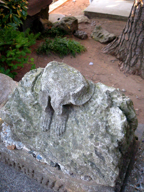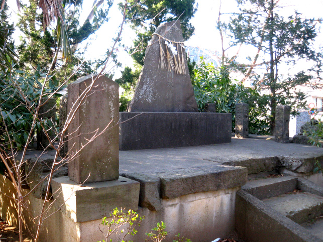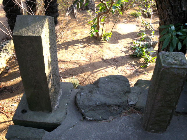 前回訪れた時にツアー参加者の皆様に紹介した猿(の足。記事内3つめの写真)の対を発見したとの連絡を、友人から受け早速確かめに行ったのでした。どこどこどこ??? まず、右側の猿足の位置を確認。すると、その向こう側、松の木の根元に…… あった! 間違いなく対の猿の足です。こちらは足首からもがれていました。 ↓鎮座していた台座はあるものの、 やはり姿がないのは悲しいですね。↓台座の位置は湯殿山の碑のすぐ後です。 猿像まで奉納した講だからかなり立派だったと思われます。社務所が閉まっていたので尋ねる人もなく、いろいろ想像をめぐらせながら境内を出ました。 松戸市で行った富士塚はこれで4つ。あと5つあります。まあ、少しずつ♪少しずつ♪