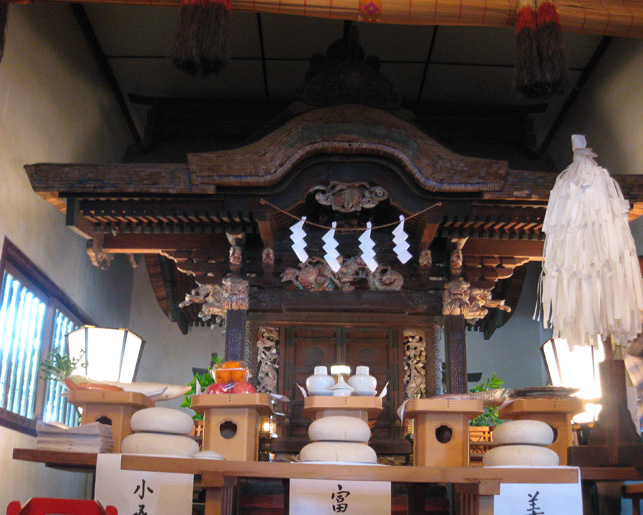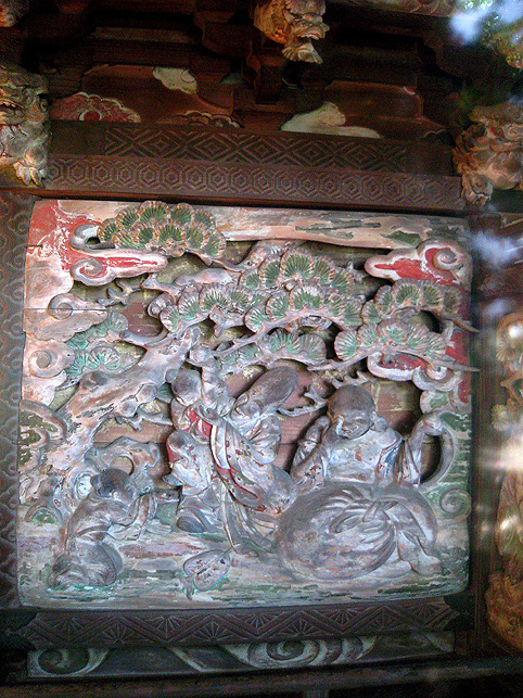 本殿は流造り/こけら葺。立派です。側面は福禄寿たち?この中にご神体が。