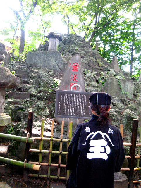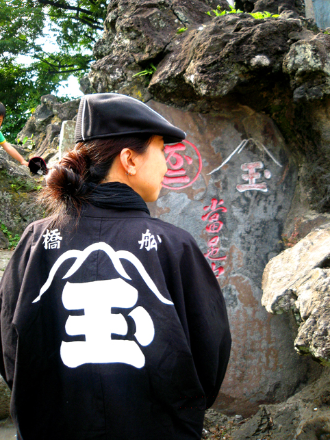 昨日は鯉口シャツ(ダボシャツ)を着て歩き回っていましたが、今日はちょっと写真用に。 記念撮影を山玉講の紋と。ほら、講碑のものと同じでしょ? (左:猫実富士 右:堀江富士) 「ふなばしから来たの?え?浦安?」と地元の方に聞かれましたが、この法被をいただいたいきさつを話したら「それはご縁があったわね〜。それにしても見事な染め抜きね」と驚かれ、話がはずみました♪ 地元では誰もが知る老舗の方で、ファミリーと従業員が皆、屋号の法被を着ています。法被に特別興味があったのかもしれません。残念ながら山玉講を知る方に会うことはできませんでしたが。。。