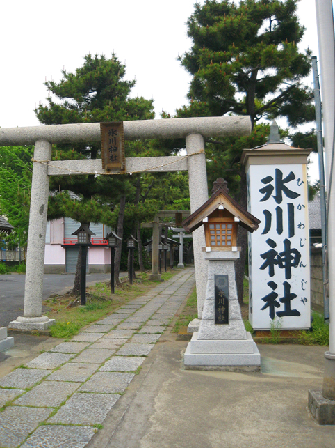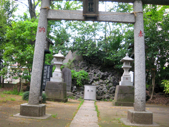 シュールな子供絵になごみながら、裏道を行きます。(これは富士塚には関係ありません。ちょっとカラフルな画像を入れたくなっただけ。笑) 伊興富士から1km余、竹の塚の東に隣接する西保木間というところにやってきました。渕江小学校の向こう側に神社があるような気がする。。。と目標を定めて学校の角を回りこみました。 ほどなくしてあらわれたのは保木間氷川神社。この神社の前の道は「流山道」といって、日光街道がこの保木間で分かれて成田山に続く道でした。西へ向かうと西新井大師に行きます。そんなことから、「成田道」とか「大師道」とも呼ばれたそうです。(そうそう、このまま東に進むと花畑につながり、素晴らしい富士山の絵馬があるという「花畑大鷲神社」もあります)ちなみに「流山街道」とは違います。 富士塚についての表記もない、静かな氷川神社の奥に行くと。。。ありました。富士塚、富士塚。 あれ?鳥居に掲げられていたのは「榛名神社」???