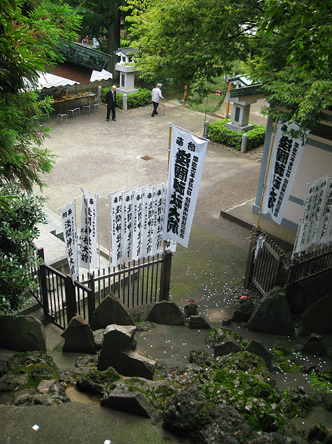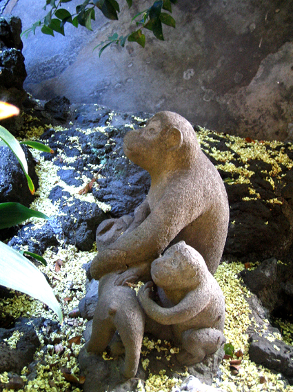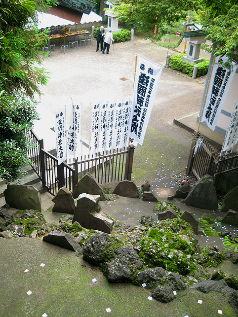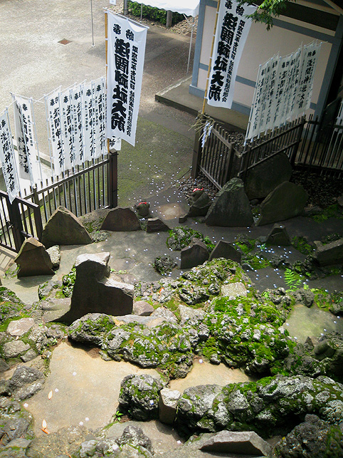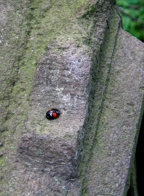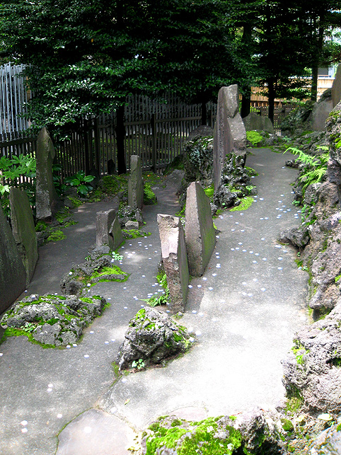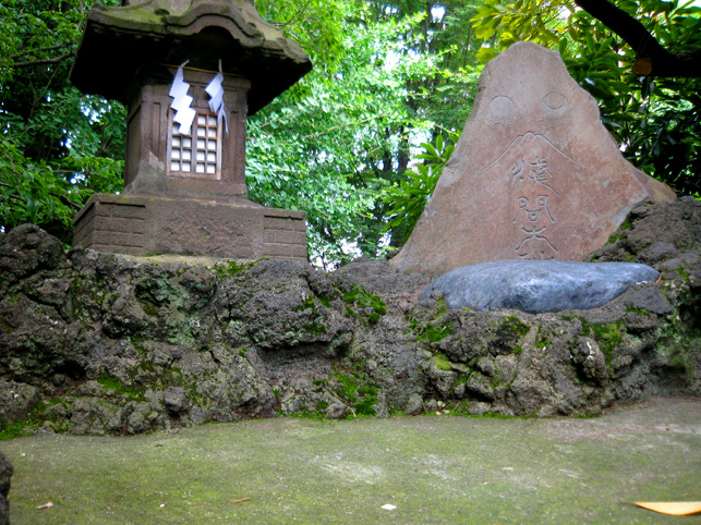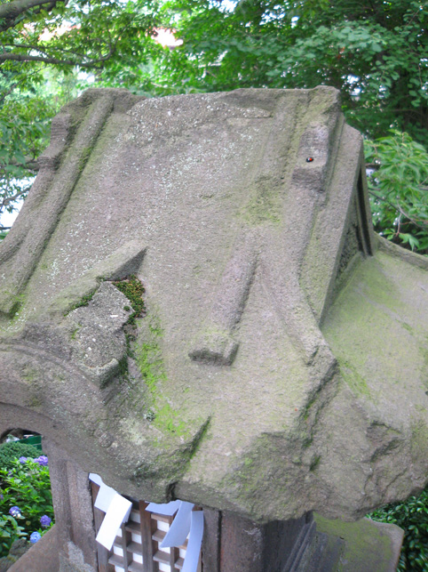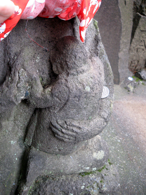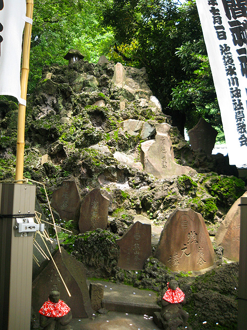 「氏子の皆さん無事下山を終えたようです。ホッとしましたよ〜♪登山口でお山をお守りするアタシとしましては、皆さんがお山を下りるまで見届けないと、という気持ちでいるんですよ。あ、あっちほうで直会(なおらい)が始まりましたね。宮司さんもマイクを持って忙しそうに仕切っています。お山はちょっと静かになりましたね。アタシの背中の紋のこと?火消しの【め組】でしょ。ほら、火消しの半纏着たお兄さんたちもたくさんいたでしょう?お山で富士講でない名前をたくさん見たって?野暮なこと言っちゃあいけません。昔からこのへんは富士講だろうが他の講だろうが、交流が多かったんです。何かを建てる時にはお互いに寄付をしたもんですよ。だからいろんな名前があっちこっちにありますって。富士講の石碑だけでもちょっと離れたところの名前があるでしょう?神田も巣鴨も落合も。あ、落合と言えば、【上落合富士】のお猿さんファミリーをご覧になりましたか?ええ、子供達がかわいかったでしょ?うちのはちょっと小さいけどね。え?まだ見てない?アタシの相方のほうを見てくださいよ」 「ほら、前掛けの下に乳飲み子がいるでしょう?」 「お山を訪れる人は年一回。でも、私たちはこうしていつもお山の入り口にいるんです。家族となら寂しくないですよ。さ、おたくもまた登ってらっしゃい。午前中は人が少ないですから」 「ここの登山道はどこかに似てないですか?はい。文京区護国寺にある【音羽富士】ですね。九十九折り?そうとも言えますけど、富士講の研究家の間では【電光型】って言うみたいです。つまり前面にギザギザの道ですね。富士塚の中には頂上の【浅間社】へ一直線に続く石段を築いたものも多いですが、ここのように登山を味わえるものもよかないですか〜。ほら、富士山だってそうでしょ?ジグザグジグザグで登っていったでしょ?うちの富士塚は明治の終わりの頃の築だけど、江戸時代に出来た下谷坂本富士や江古田富士も同じ形。これだと大勢でゆるゆる登れる。それって楽しいでしょう?」 「合目石や講碑もいいけれど、中腹よりちょっと上のこれ。残念ながら頭が欠けていますが、講祖のお姿と烏帽子岩の碑ですね。氷川神社の宮司さんはこちらを角行さんとおっしゃってたけど……どう見ても身禄さんですよね。左端、大きめの烏帽子岩がありますが見ましたか?」 「あれもう頂上ですか?せっかちな人ですね〜。頂上はわりと広めの平らで大人が数人乗ってもこぼれませんね。あ、あなたさっき頂上でここ近くにお住まいの人とお話になってましたね。富士塚をちょいちょい回ってらっしゃる若い方で、富士山の下のほうにある【新屋山神社の奥宮】のこと詳しい方でしたね。あなたはまだ行かれてないんですって?車でないと行くのが難しいって言われてましたね。笑」 「どうしたんですか?祠の前で立ち止まって。さっきお参りはしたんでしょう?」 「あ、お祭りにふさわしい姿のてんとう虫ですか。確かにかわいいですね♪」 「あれ、いつの間に直会もお開きになって、地元のご隠居おふたりだけになっていますね」 「あらら、ご婦人の方がお帰りになった?」 「そして誰もいなくなった。ええ、ちょっと寂しいけれど、ほら、急におてんとさまが射してきましたよ。それに、気持ちいい風が吹いてきて……まあ、しばらくゆっくりしていらっしゃい。あ、それよりさっき宮司さんの案内で見せていただけたウラの画像はどうしたの???」