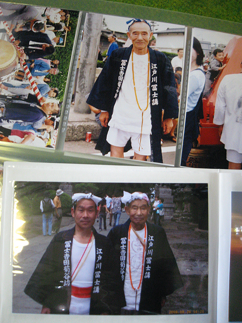 おまけですが、ちょっと嬉しいことがありました。 実は、お山開きに出かける前に、品川丸嘉講社の方たちが富士吉田の御師「菊谷坊」と縁があることを知り、当日、あるものを持って行きました。 10年前に富士吉田の火祭り(富士山のお山じまい)に行った時に出会った強力さんの写真です。もしかしたら御存知かなと思って。 上が私のアルバム、手前は品川講社の方たちが一昨年行かれた時のアルバムです。 同じ強力さんが写っていました! 先達が言いました。「ミツジだよ!スズキミツジ。まだ生きてるよ〜♪」 それを聞いて嬉しかった〜。ちなみにミツジさんの法被にある「江戸川富士講」というのは、丸星講だと思います。