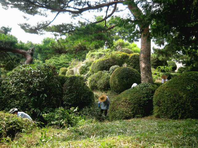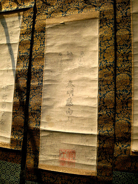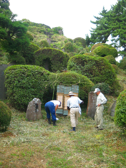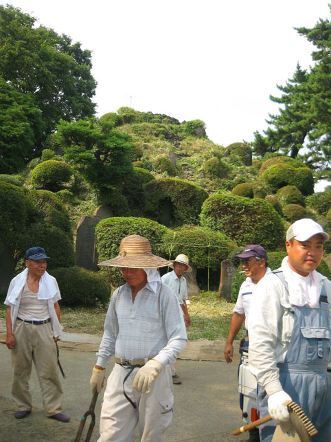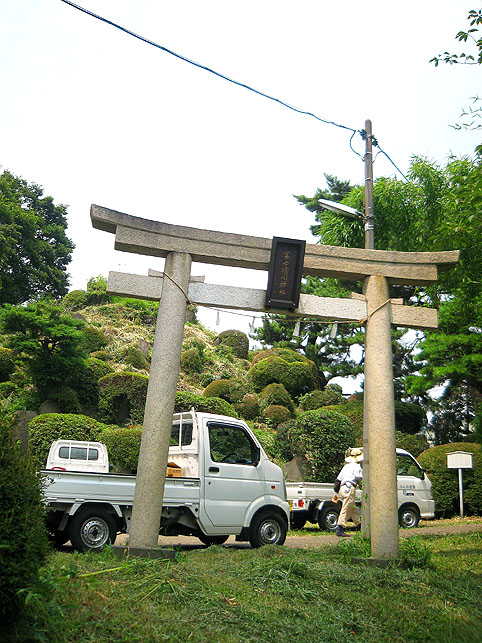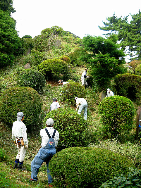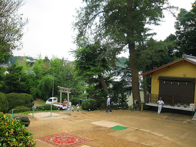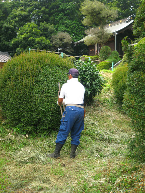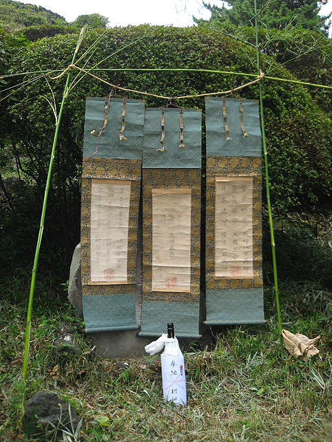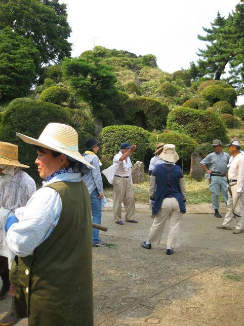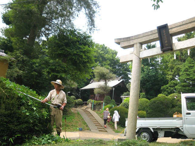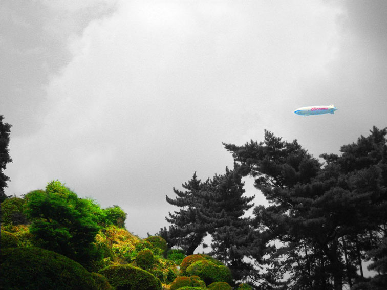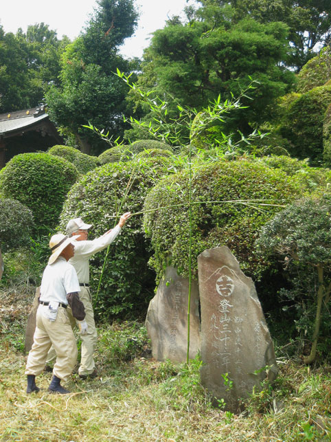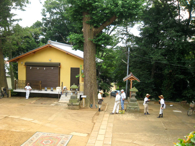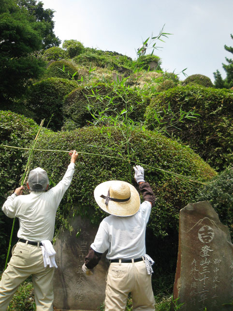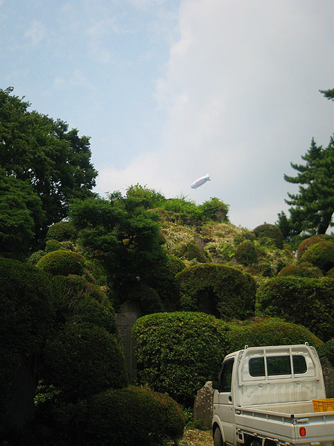 いつか富士塚の上空にもUFOが出現すると思っていますけど(笑)、この日はdocomo号がお山開きのお祝いに駆け付けてくれました。。。なんてね。でも、富士塚にブリンプなんてとてもお似合いです♪ さて、 空の物体がお山の向こうに消えた頃、 八坂神社の境内に 集まっていた人たちが、 大泉富士の掃除に集結。 見事な植木の刈り込みや、 細かい草刈り、 塚の裏まで綺麗に整えて、 お山はみるみるうちにさっぱりしてきました。 「このへんに、笹竹を立ててっと。。。」 「今度はこうして横に渡して。。。」 「縄を結わいて。。。」 もうちょっとしたら 始めるね。 「御三幅」を日の下にてお披露目です。 講元のおうちに代々伝わるこれ。お馴染みのお姿です。 つづく。