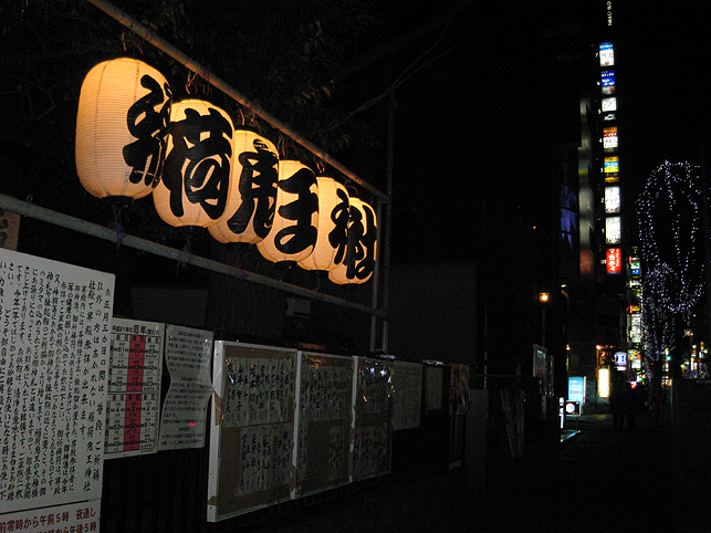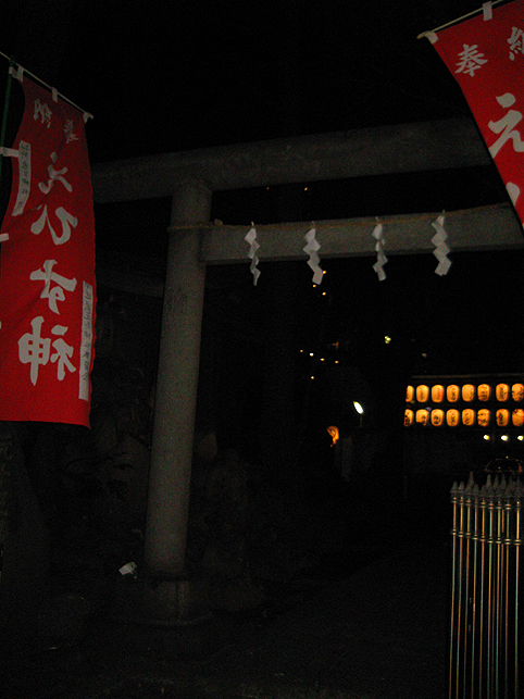 もう先週のことになってしまいましたが、NYから来た友人と、新宿で10年ぶりの再会をしました。ちょうどその日は、新宿七福神めぐりのため期間限定で成子富士へ登れる最終日(7日)だったので、もし都合がつけば、友人と一緒に行ってみようかとも思ったのですが、お茶しながら積もる話であっという間に夜。ふたりとも風邪ひいてたこともあって、長時間の散策はやめました。 でも、ちょっとここは夜でも訪れたくなるところです。稲荷鬼王神社は、歌舞伎町のはじっこ。 ここも新宿七福神のひとつ。えびす様がいます。 この富士塚は、前の記事のイラストの左下のように、ふたつの山が富士山をあらわしています。裏の通りから、浅間神社の鳥居越しで撮りました。実際はこんなに暗くなく(フラッシュ使ったせいです)、スポットライトも当たっています。夜訪れてもいい富士塚はここだけ。 神社やお寺には、初詣とか祭りの時以外、夜には行かないほうがいい(スピリチュアルな面でも)ですが、ここは特別。なぜか、「特別に大丈夫」という感じがします。歌舞伎町だから?鬼を祀ってあるから?う〜ん。両方でしょうか(笑)。参拝者も数人いました。(でも、治安面でも一応気をつけましょう) 見上げると、富士塚の真上、イチョウの木の枝に絡まるかのように、満月に近い月が煌々と光っていました。