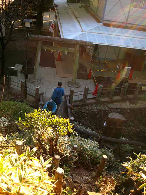 千駄ヶ谷富士のある鳩森八幡神社の宮司さんに、本の報告をしましたところ。。。 喜んでいただきました♪ 嬉しかったです! でも、富士塚のそばがこんな状態になってる〜。何か工事してるんですか??? 聞くと、社務所の改築で今年いっぱいこんな具合だとのこと。 「あ、でも、富士塚はいつでも登れますからね〜♪」って念を押されました。 ホッ。いつものように、富士塚は夕方になっても癒しオーラをふりまいています。 風水によると、ここは富士山からの龍脈が繋がっていて、パワーゾーンだということですよ♪ そうこうしてると、学校帰りのボーイズが千駄ヶ谷富士にやって来ました。 「写真を撮ってる人がいるよ〜」と私を挑発しながら走って逃げました。 彼らを追いかけてもよかったけど、ほっておいたらつまんなそうな顔。(笑) 今度遊びましょう♪ 塚の背後には、樹齢400年の大木もあります。何の木だったっけ? これに会いたくて訪れる人もいますよ。いい木です! 登山道の背後にある「小御嶽」も、新年のおめかしをされていました。 そのそばから頂上を目指します。こんな感動的な夕陽に迎えられました♪ 頂上の奥宮。 傍らの「釈迦の割れ石」。 下から見た、釈迦の割れ石です。こんな傾いた岩なのに、地震にもよくぞ耐え現在に残ってくれてます。この千駄ヶ谷富士は、築造が最古ではありませんが、江戸時代からの山容を変えていないという意味(他の富士塚は、移築などが多いため)で最古の富士塚と言われます。 鳩森八幡神社。都会の中にありながら、いい「気」に満ちた場所です♪ 江戸の人たちもそれを知ってここに富士塚を築いたのかもしれませんね。 この直後、ご近所のお店で面白い情報をいただきました。 「あそこはね、平岩弓枝さんの身内なんだよ〜」 合点がいきました! 時代小説を書かれている平岩さんが、しばしば作品の中に富士塚を登場されているのが。 私の本の中でも、平岩さんの著書からちょこっと紹介しております。(p36) さてこの日、新しくいただきましたお守りはコレ。パソコンに貼るといいようです。 おかげさまで、これを貼って以来私のMacも順調です♪