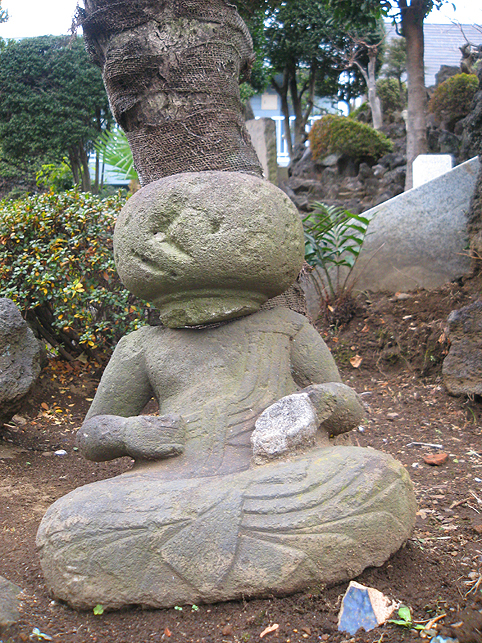 富士塚は、訪れるたびに違う発見があります。 いろいろ観察しているつもりでも、やっぱりそうです。 前回ここに来た時は夏だったから、塚の裏は草に覆われていて、まわり込むことはできませんでした。新年を迎え、氏子中が丁寧に植木の剪定と塚の掃除をしたらしく、富士塚はとてもすっきり。お中道を歩くことができました。 まあ、それは想定できる範囲です。でも、仰天だったのはコレ。塚の横で見つけました。 メントスキャンディのCMのキャラのような丸いアタマはなんだ??? こんなでした。背後の富士塚がよく見えますね? 私はてっきり「大日如来」だと思いました。富士塚でしばしば目にするからです。首なしの大日如来に、石造りの柱の先端の擬宝珠(ぎぼし/ぎぼうしゅ)を誰かが乗せたのだ。そう思いました。 でも、「印相」といって手の形が違う。大日如来にしては、左右の手が離れ過ぎてるのです。 大日如来が結ぶ印は、金剛界と胎蔵界では形が違う(前者は智拳印、後者は法界定印)けど、このメントス像はそのどちらでもない。では、この仏さんは。。。誰なんだ!? 右手に何か持っていたような手の形、腕を引いた位置、等からして、やはりこちらも富士塚でよく出会える「不動明王」かしら。。。 まあとにかく、こちらに訪れた方はこの像を動かさないようにしましょう。どういういきさつでこうなったかわかりませんが、ナゾのものにも理由があります。手に触れないことが大切です。