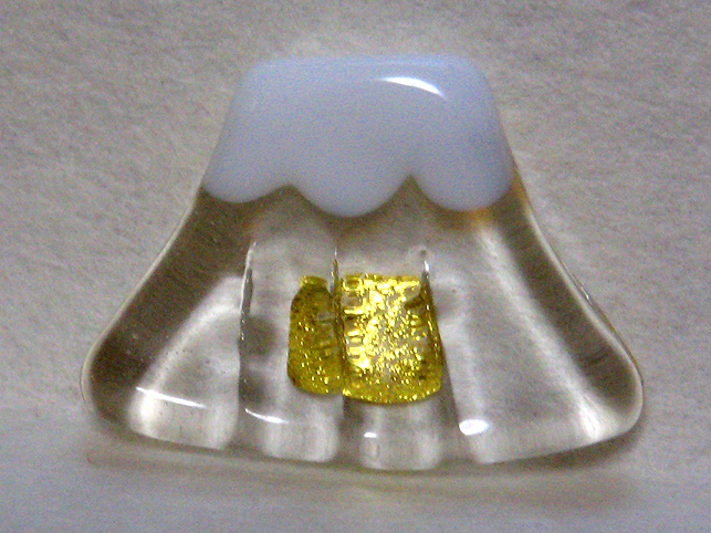 富士塚が好きでも、富士山に登っても、忘れたくない気持ちがあります。 富士山が見えて嬉しい♪富士山のある国に生まれてよかった♪。。。等の とても素直な気持ち、と言ったら一番近いでしょうか。 ある富士講の先達が言った言葉に、印象深いものがありました。 「富士山は『征服』する山ではないです。有り難いと思って登るのです」 これには目からウロコでした。 一部の登山家にとって、富士山は「体慣らし」程度の山かもしれません。 でも、これほどまでに人々に愛される富士山は、やはり特別なお山です。 それは、スーパー聖なる山という特性からでしょう。 いくら富士山に登るといっても、「ありがたい」を忘れたくないですね。 そういう気持ちを持つことが、心を豊かにしてくれるような気がします。 有り難い気持ちはカタチにするともっと有り難い。 最近、お気に入りの富士山グッズは。。。 ある陶芸家が創った、ありがたい富士山の姿の箸置き。 (この中からひとつ選ぶつもりが、全部よかったのでいただいちゃいました) ガラス製のお守り。長寸1cm強。背後にあるのは金箔。財布の中に。 なんと、縁起のよい姿でしょう。