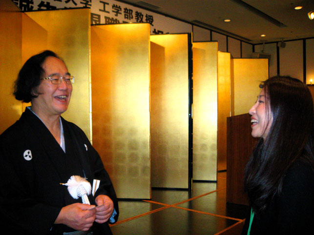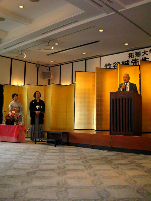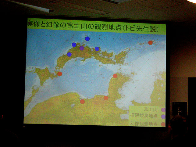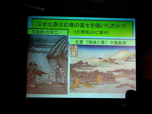 2年前の日記にも書きましたが、私は北斎の「琉球八景」が荒唐無稽で大好きです。 これは、現・那覇のバスターミナルあたり。 富士山の見えない土地に富士山を描いてしまうとは、なんと創造的かつ大胆な行為でしょう。北斎は、絵のうまさよりもこういう発想がイイ!(方向性はちょっと違うけど、これまた私の好きなイサム・ノグチの「火星から見られる彫刻=NASAが火星探知機を使って発見した『人面岩』より30年も前に構想していた作品=カタチがそっくりで有名」と同じくらい好きです) でも、富士塚に想いをはせている人の中で、「琉球八景」を面白がる人がいないと思っていたのですが、今日受けた講義の中で、いきなり出てきて嬉しくなりました。 ちなみに左の「兀良哈(おらんかい)」というのは、中国の地名。 教鞭をとられていたのは、富士山の研究者として竹谷靱負の名で知られる、拓殖大学工学部の竹谷誠教授。定年退職のため、本日の講義が最終とのことでした。最近知り合った方からお誘いをいただいた私は、いそいそと受講に出かけた次第です。くわしい内容は省きますが、いや〜実に面白かった♪ 上部の弓なり部分が日本です。 竹谷先生は理系の頭脳ではありますが、いろんな意味で、豊かな感性は研究にも大事なのだなと痛感したのでした。 講義の後のパーティで祝辞を述べられる岡田博先生。お会いできてよかったです。 オマケの画像デス。↓ 何をしゃべったか、全く覚えていない私でした。